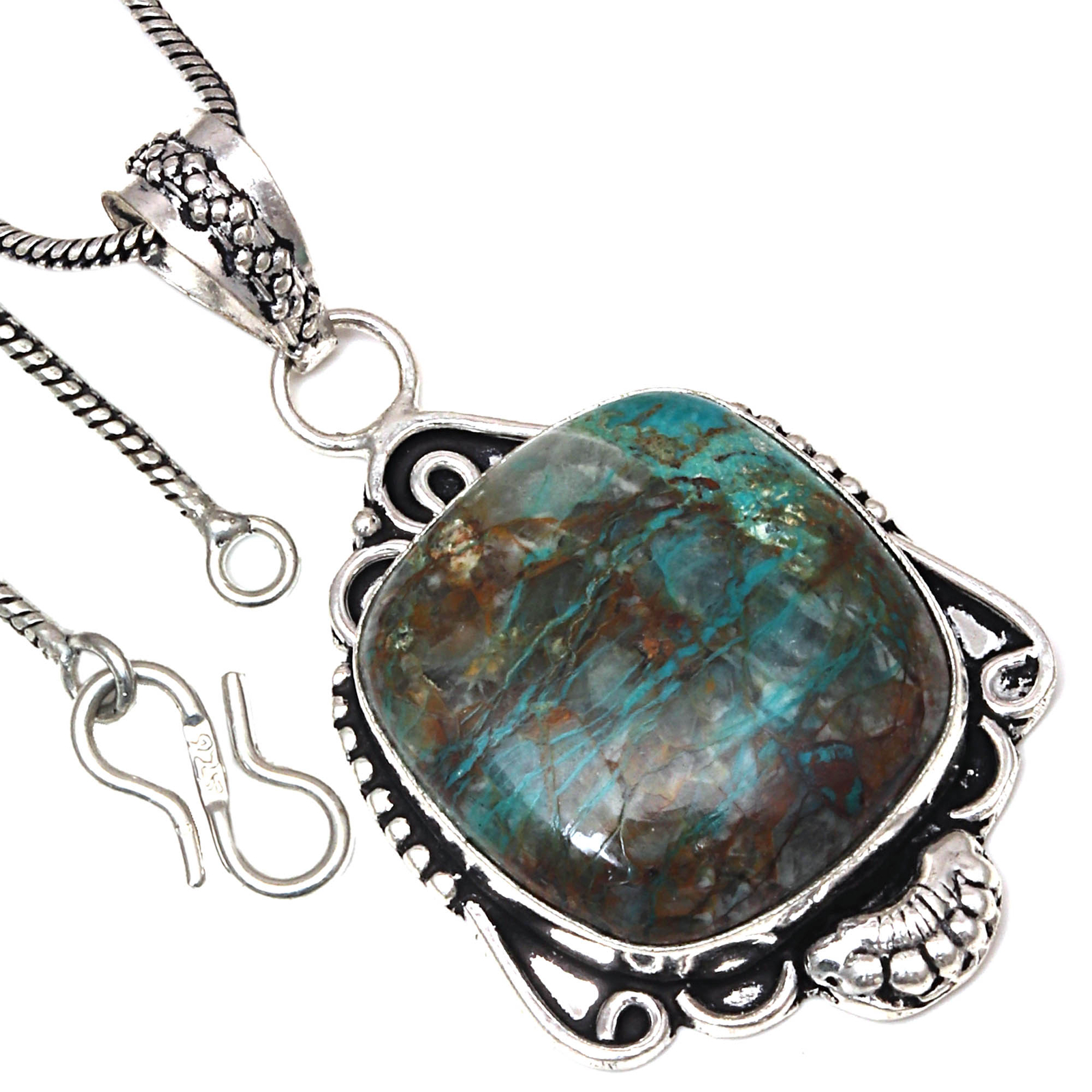 This stunning chrysocolla pendant is a true work of art! The vibrant blue-green gemstone is beautifully set in handmade ethnic silver, giving it a unique, bohemian charm. Perfect as a gift for her, the 2" pendant feels lightweight yet durable, and the 925 silver ensures lasting quality. The craftsmanship is exceptional—every detail reflects care and authenticity. Whether dressed up or down, it adds a touch of natural elegance to any outfit. Absolutely love it!