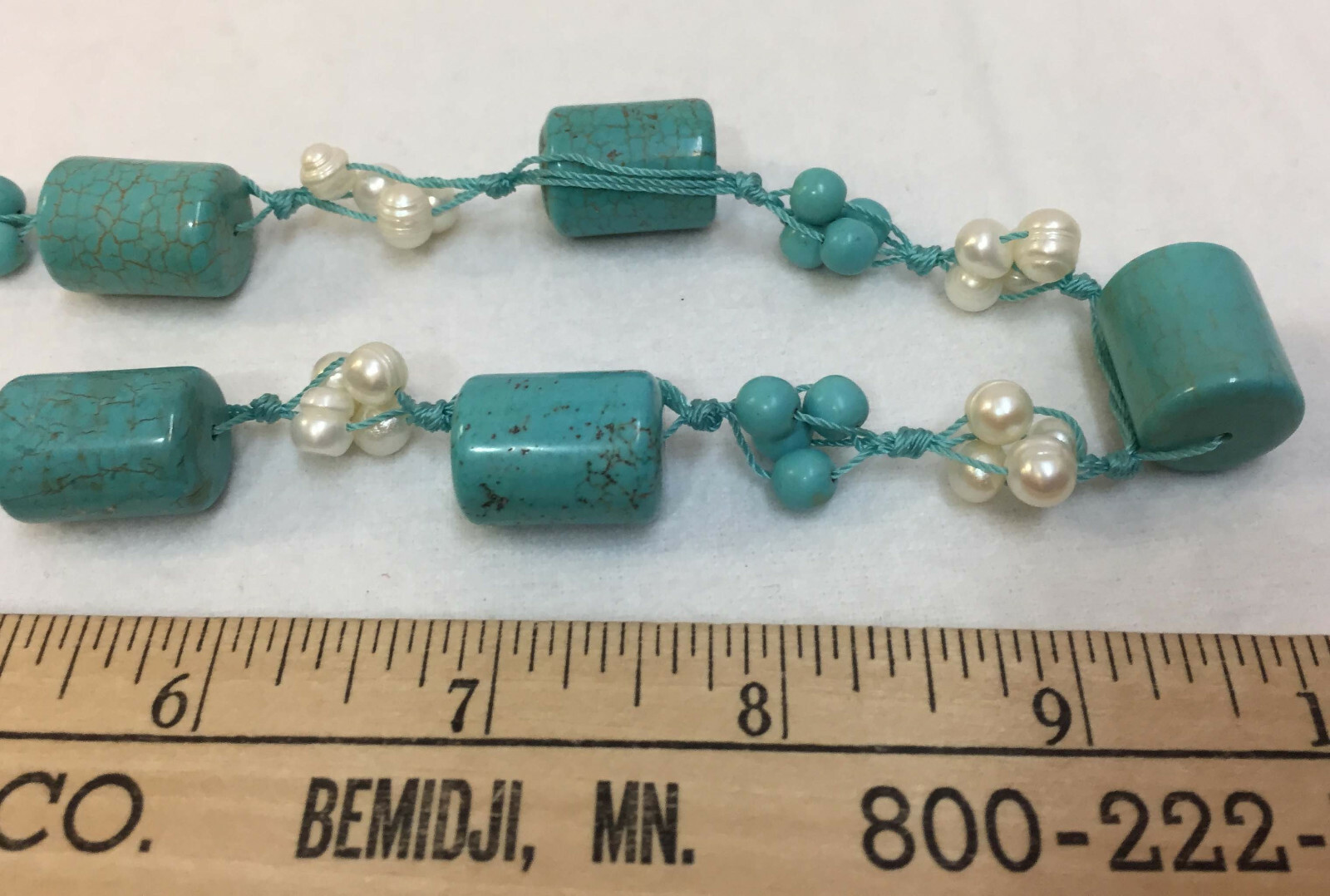 This necklace is made out of heavy stone beads (not sure if they are genuine turquoise stone) and faux round fresh water pearl beads. Measures Approximately 19" Long - 9/16" Wide Check out my pictures and message me any questions! SHIPPING CHARGES ARE QUOTED FOR LOWER 48 STATES USA ONLY. For shipping to Alaska, Hawaii and Puerto Rico, and other countries please message me requesting shipping cost. Thanks for looking and have a Great Day! # 62303 JP JL 1829