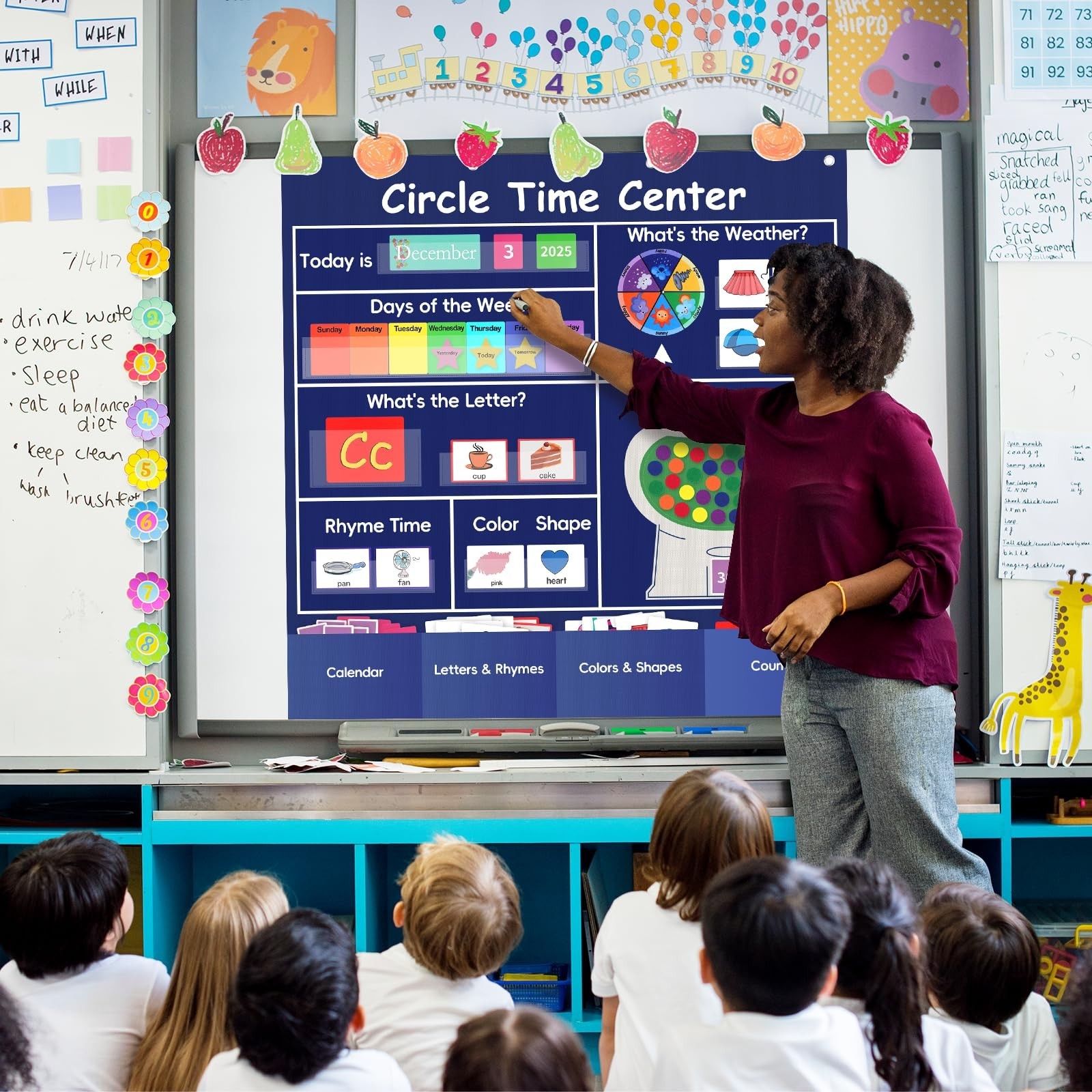 Circle Time Learning Center Classroom Pocket Chart, Circle Time Calendar Preschool Include 224 Cards, Educational Pocket Chart Material, Learning Calendar Weather Letter Counting Color Shape Product Details Color: Blue Brand: Ottkids MPN: Circle Time Center-Blue UPC: Does not apply EAN: Does not apply Product Dimensions: 39.7 x 39.7 x 0.39 inches Item Weight: 2.27 pounds Item model number: Circle Time Center-Blue Manufacturer: Ottkids PVC Imported Circle Time Learning Center Set: The Circle Time Learning Center includes a pocket chart, 224 educational cards, 30 sticky counters, and a round weather wheel. This alphabet learning pocket chart is an important classroom learning resource for teachers to conduct instruction Large Size:Calendar pocket chart measures 39.76"(L) 39.76"(W). This circle time pocket chart features smooth and sturdy metal holes above for easy hanging anywhere, and there are 4 storage pockets at the bottom to store extra cards(not including hooks) Essential Tools for Learning:Our circle time chart provides practice in calendar concepts,talphabet recognition, rhyming words, counting, weather patterns, shapes, colors identification. It covers a variety of topics and makes education fun, greatly enhance children's emotional expression, foundational knowledge and hands-on skills in their daily learning High Quality Material: Ottkids Circle Time Center Chart is crafted from durable 420D polyester, sturdy and tear-resistant.Its transparent PVC pockets are eco-friendly and easy to wipe, leave no residue,giving you peace of mind during use. When you're not using it, this learning pocket chart can be folded and stored without taking up too much space Versatile Application: Circle Time Center Pocket Chart perfect for classroom instruction, family education, student exchange,group discussions, student demonstration and more(Tip: Please allow time to cut the cards before using the centers pocket chart)