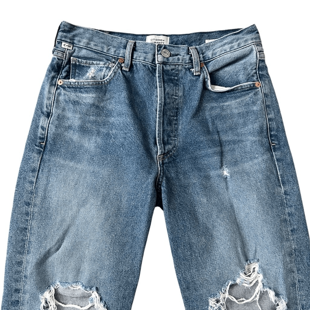 Citizens of Humanity Charlotte Straight Leg Distressed High Rise Jean Cropped. Distressing extends down hole on right leg. Great used condition with no flaws. Size 26. Waist - 14” Inseam - 28” SKU 111824