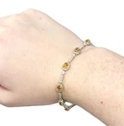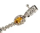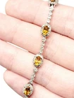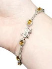 ITEM SPECIFICS: Beautiful 10 station oval citrine stone with a halo of rounds diamond bracelet. This bracelet features 10 oval links of citrines, prong set. The citrine stones are surrounded by a halo of round diamonds. It between each citrine are round diamonds, set with a round or square bezel. The round diamonds are H in color and SI in clarity. The total amount of diamonds featured are 141 with an approximate total carat weight of .70 carats. The bracelet is made of shining 14 karat white gold. It is approximately 6.75" long and has a safety clasp. The clasp has diamonds on it for a continuous look. Stamped on the clasp is 14K. This bracelet comes with an independent appraisal from Gemological Appraisal Laboratory of America, Inc. It has a value of $2,500.00 It will arrive in a new bracelet box. Thank you for looking at our listing. ITEM CONDITION: In excellent condition, professionally cleaned and polished.