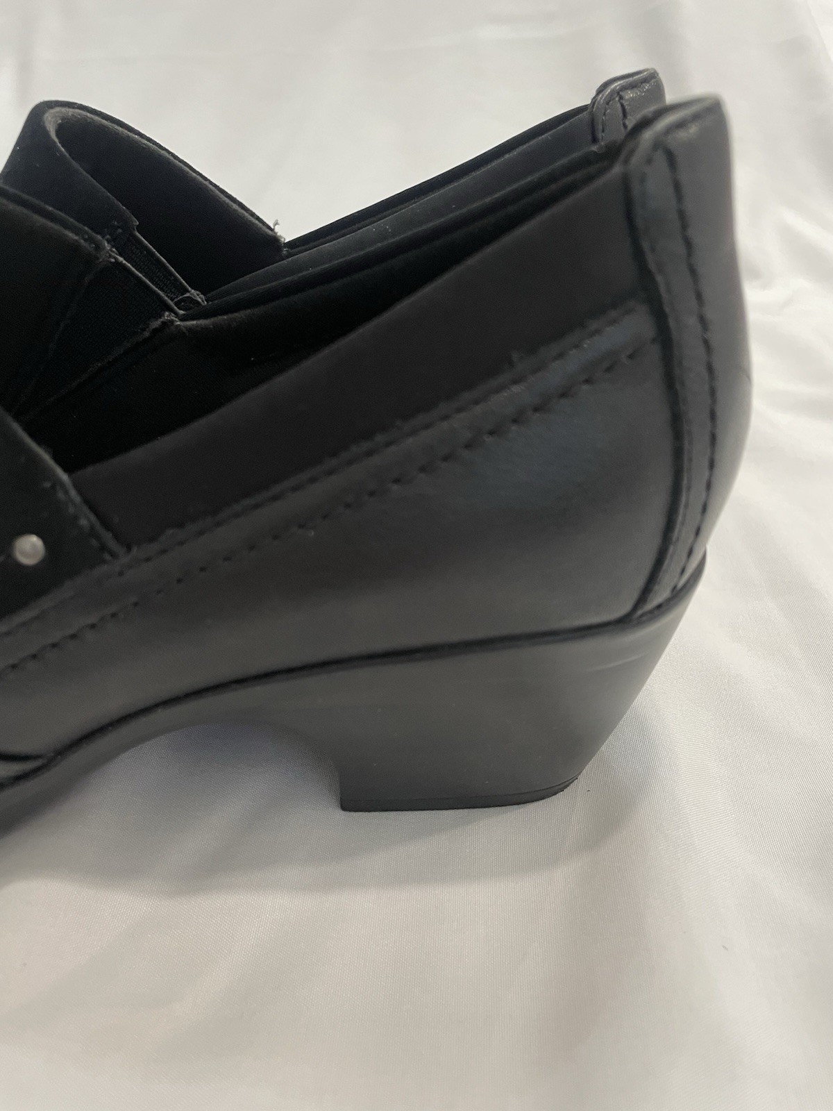 The Clarks Collection Emily Step Women's Black Leather Slip-On Loafers in size 8M are a stylish and comfortable option for various occasions. Featuring a solid black color with studded accents, round toe shape, and mid heel height, these loafers are perfect for travel, parties, casual outings, or business meetings. The leather upper material and cushioned foot bed provide ultimate comfort, while the synthetic rubber sole ensures slip resistance. These versatile loafers are a classic addition to any woman's wardrobe, suitable for all seasons. Never worn. New without the tags or box