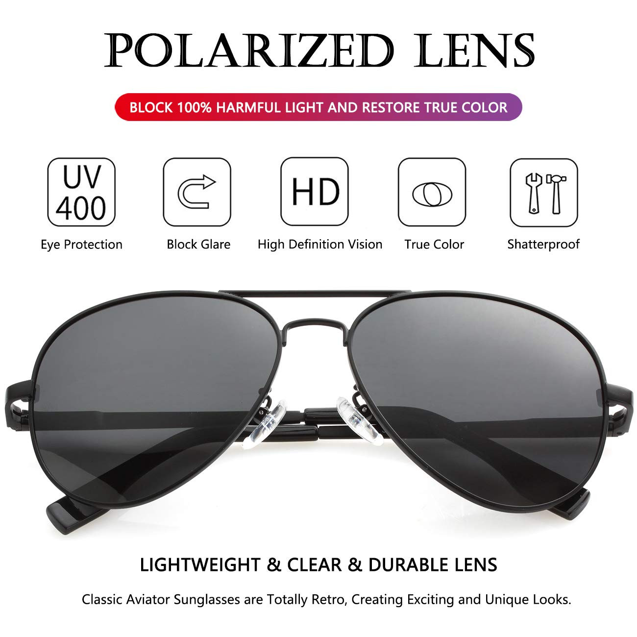 POLARIZED GREY LENSES ►The world seen through polarized grey lenses; grey lenses drastically reduce the brightness of shiny surfaces, like chrome, and large bodies of water. Polar lenses reduce reflections and enhance contrast and provide remarkable color contrast. Improving visual clarity and reducing eye strain. CLASSIC AVIATOR FRAME ►Ergonomic design frame, a curved brow bar, reinforced metal hinge, adjustable nose pads, and metal temples with plastic end tips rest, classic design make these polarized sunglasses for men and women more comfortable and durable while you are wearing. ULTRA - LIGHT WEIGHT MATERIAL ►This aviator sunglasses is made of high quality stainless steel materials, so the frame is super light, but very strong. The classic design makes men and women polarized sunglasses suitable for almost all face types, let you wear will feel very comfortable and there will be no pressure on your nose. STYLISH CLASSIC BRAND DESIGN ►Personalize your style from a variety of frame colors and lens treatments including G15, grey and purple mirror. Color your world and complement your look with perfect glare free vision. Deflects envious glances and gives you that unique look. PROVIDE BEST PRODUCT AND CUSTOMER SERVICE ►In case any accident of the shipping or unexpected damage happened to these polarized sunglasses. Please contact us without hesitation to solve the problem until satisfaction, you have no risks to try. And we will provide best product and customer service to you.