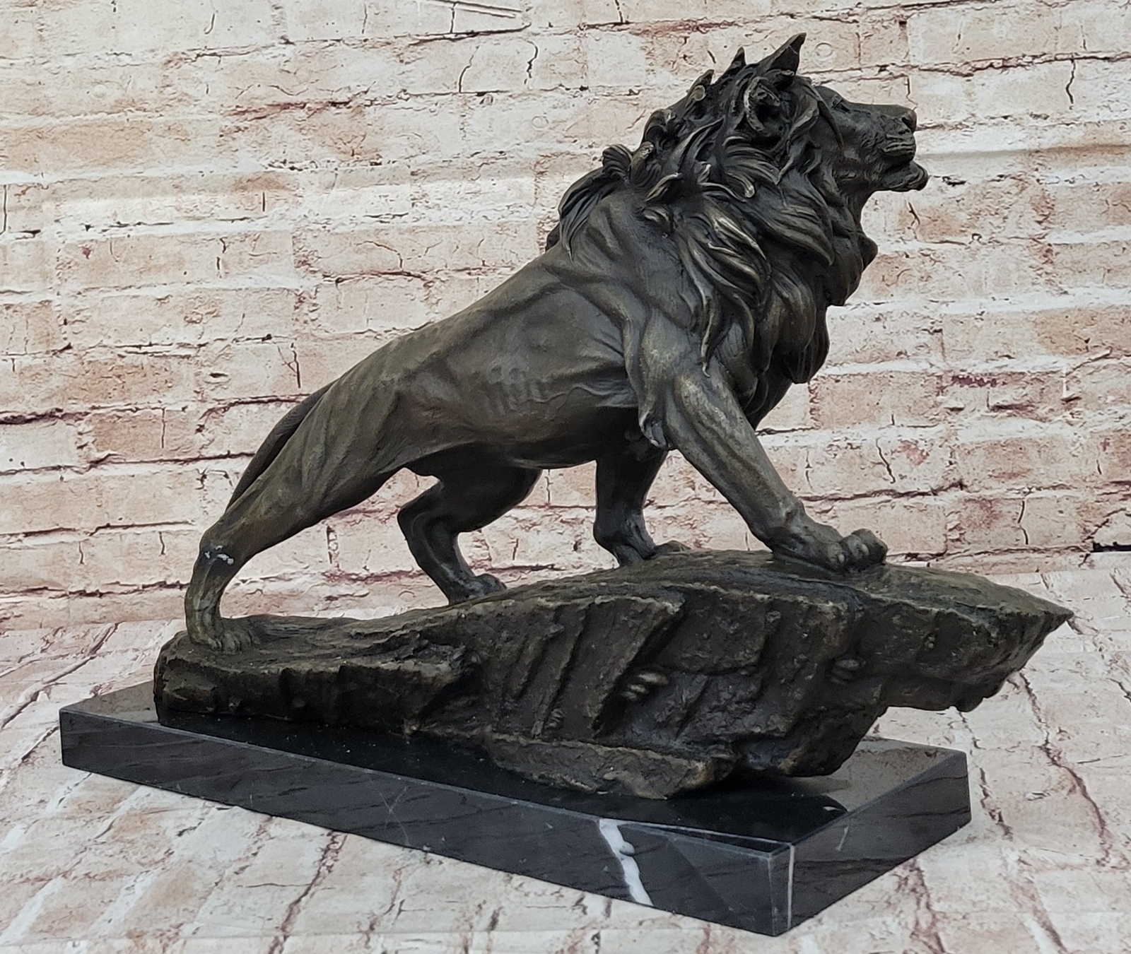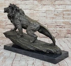Classic Pure Bronze Copper Africa Lion Statue Evil Foo Dog Lion Sculpture Gift Classic Pure Bronze Copper Africa Lion Statue Evil Foo Dog Lion Sculpture Gift Condition : This sculpture is in perfect condition. Bronze Dimensions with Marble Base: Height 14" X Width 22" Marble Dimensions:18" X 6" Height without base:13" Weight:35 LBS Inventory:27YRD67814572 Behold the majestic presence of the regal lion in all its splendor, immortalized in this breathtaking bronze sculpture. As the golden sun dips below the horizon, casting its ethereal glow, the lion ascends a cliff with an air of undeniable authority. Its magnificent mane ripples in the plains winds, a testament to its untamed strength and dominance. With a commanding gaze, the lion surveys its kingdom, a realm teeming with life and vitality. This sculpture captures not only the lion's physical prowess but also its symbolic significance—a representation of courage, power, dignity, and the unwavering spirit of royalty. Crafted with meticulous attention to detail, this handmade bronze sculpture is a true testament to the artistry of the lost-wax casting method. The intricate textures of the lion's fur, the intensity of its expression, and the sense of motion as it climbs the cliff are all masterfully rendered. A rich brown patina finish both protects and enhances the sculpture's timeless beauty, ensuring its endurance for generations to come. Resting upon a dignified black marble base, this artwork bears the signature of the esteemed artist Barye, a mark of quality and exceptional craftsmanship. Invite the regal essence of the lion into your space with this remarkable bronze sculpture. Whether displayed in a home, office, or gallery, it serves as a profound reminder of the lion's enduring symbolism and its role as a guardian of power and wisdom. As a focal point of admiration and contemplation, this sculpture encapsulates the very essence of majesty and strength. Extra Large Wild African Lion on Prowl Wildlife Safari Bronze Sculpture by Barye www.bronzhaus.com Video will open in a new window Using the eBay App? Paste link into a browser window: [isdntekvideo] Shipping Terms : Most of our items are shipped via USPS (United States Postal Service) mail or UPS. Most orders are shipped within 24-48 hours of purchase. Please be aware that not all items are available for USPS shipping due to size and weight. We do ship to Hawaii, Alaska, Canada, Puerto Rico, APO/AE, and U.S. Virgin Islands, however, an additional charge may be required. Please contact us before making any purchases in these areas. For Non-USA customers, you may be responsible for all duty, tax, brokerage fees that may be due upon delivery (shipping costs cover freight charges only). We also ship internationally. Please refer to the "Shipping and Handling" chart for the rates for each area. Payment : We accept just about any form of payment. PayPal, Master Card, Visa or American Express credit cards. Money orders, cashiers checks, and even personal or business checks. For governmental institutions, we will also accept a purchase order. Please understand that for personal or business checks we have to wait for the check to clear (usually 7 days) before shipping. Condition : New Detailed Hand Crafted Hot Cast Bronze Satisfaction Guaranteed. This is Stock Photo, Slight Color Variation!! Listing and template services provided by inkFrog