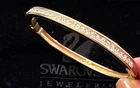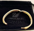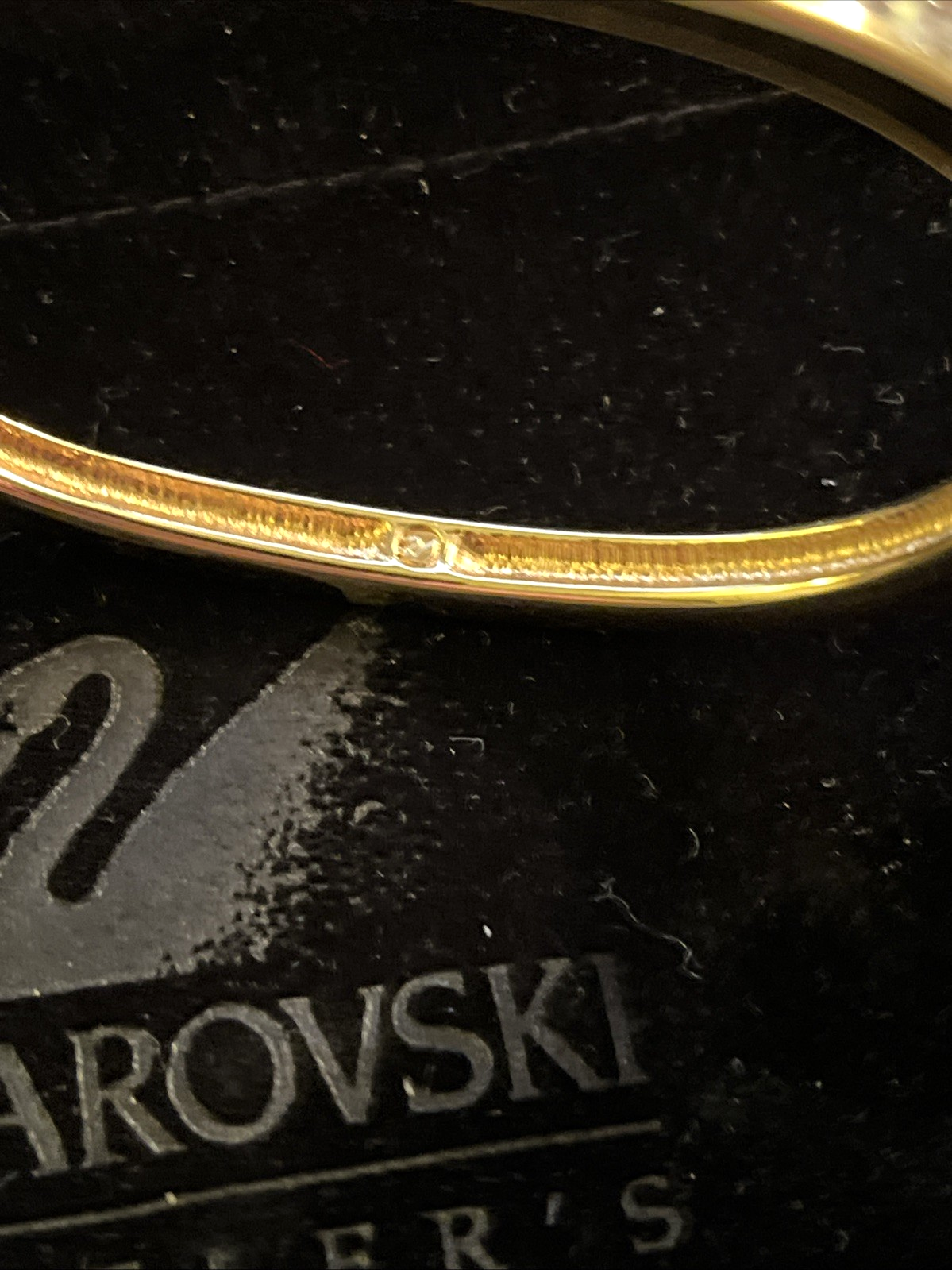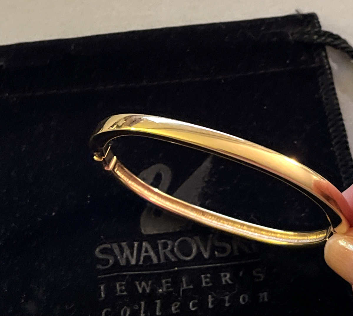 This is for a vintage but classic Swarovski crystal rhinestones hinged bracelet. It is about 5 mm wide. The interior circumference is about 7 inches. It weighs 22.7 grams. "swan logo" is stamped on inside. The bangle can fit for wrists up to 7 inches. Condition is previously owned but excellent and mint as shown. All rhinestones crystal are intact and sparkling. A dime is placed for size reference and not included. A Swarovski drawstring pouch shown in the photo will be included. Please review the pictures, description and ask all the necessary questions before purchasing this item as all sales are final! * * * Non-smoking environment! * * *