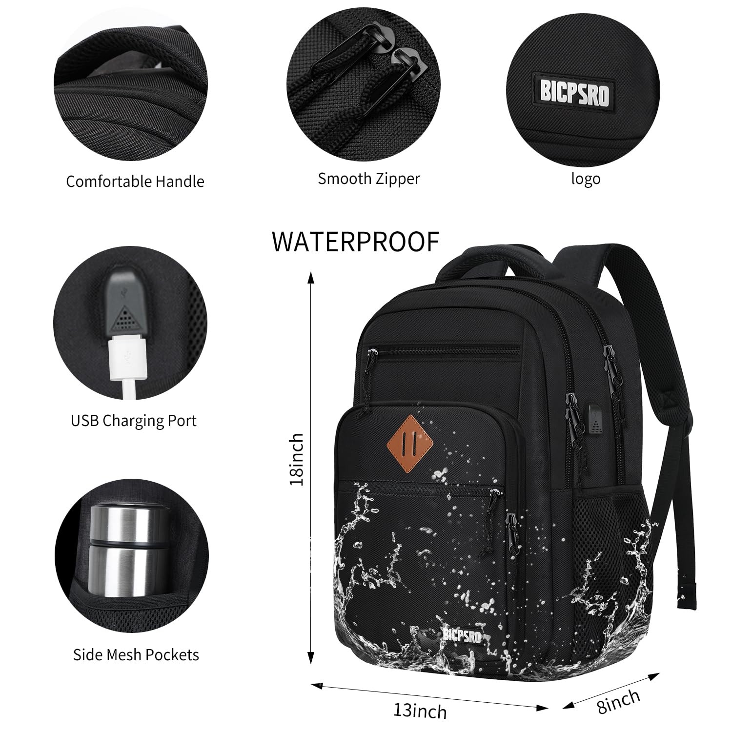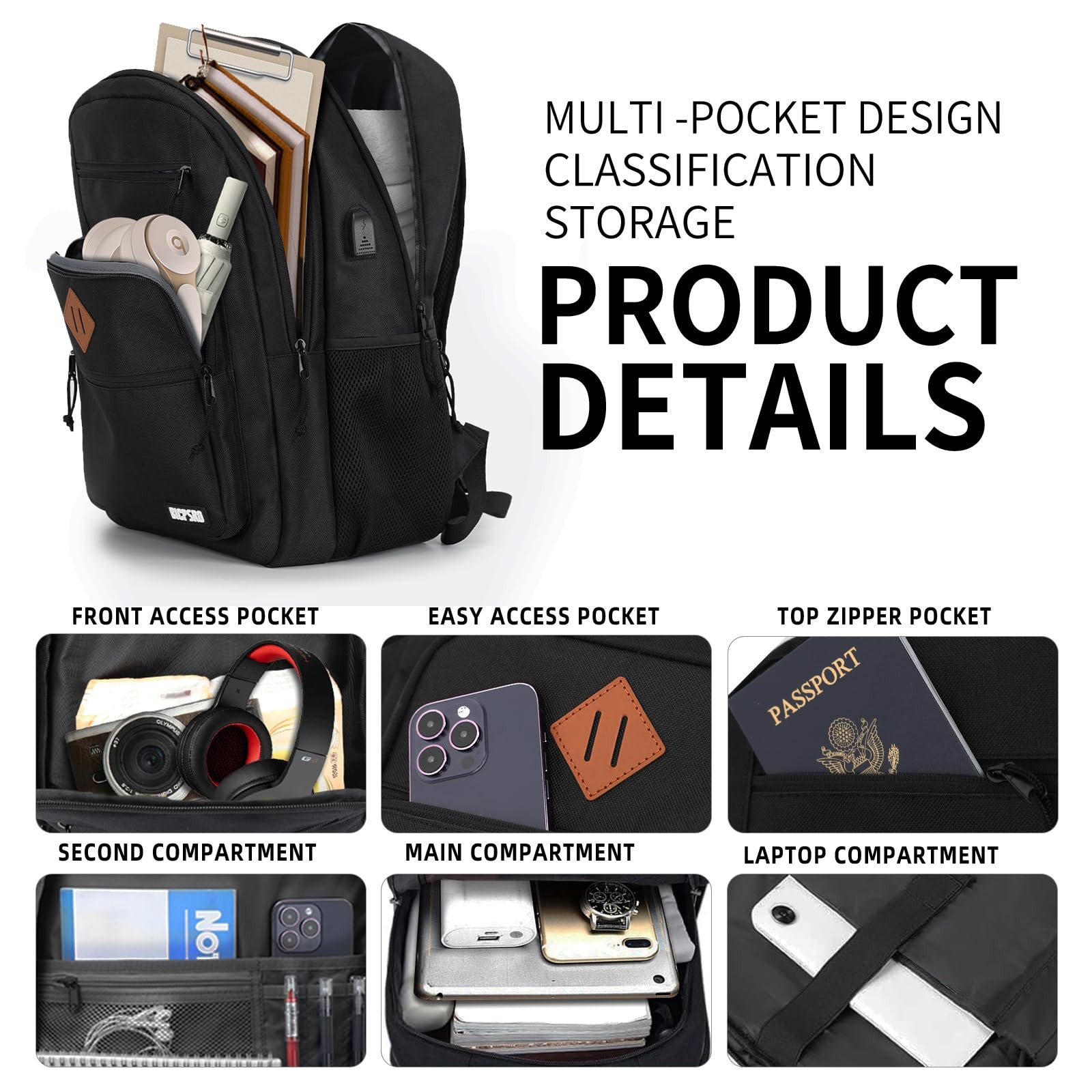 Specification Size: 18.5 X 13 X 8.5 inches Weight:1.5lbs Gender:Male and female are not limited The backpack materials: soft sturdy materials, washable and comfortable. Style: daily casual/business/travel Kind Reminder: 1-3cm error of measuring is a reasonable range due to different measurment methods. Classic Design: One big pockets with laptop compartment with thick foam can hold 15.6 Inch Laptops,could well protect your laptop when falling down. Main pocket is spacious,you can put clothes,books,stationery etc. in it.Also with organizer pockets,make your items easy to find. An ideal school backpack, laptop backpack,work backpack. Comfort: The school backpack is ergonomically designed with padded shoulder straps and a breathable back panel. This ensures that the weight is evenly distributed and reduces strain on the shoulders and back, making it comfortable to carry even for long periods. Multi Function: Our backpacks with a built-in USB charging port, easy to charge your phone when on-the-go (Not includes the power bank). With a luggage belt on the back panel, it is easy to put on the luggage handle when travel. One hidden anti-theft pocket to protect your important items. Quality Material: Laptop school backpack for men/women is crafted from premium water-resistant polyester, complemented by sturdy metal zippers, ensuring longevity and protection against the elements. This functional masterpiece is not just about aesthetics; it's backed by a 1-year warranty, reflecting our dedication to quality and your satisfaction. Usage:This school bag will be a perfect backpack for College. Also as a casual girls/boys bookbag, middle/high school mochilas escolares para adolescentes for student. A good gift choice for men/women and present for back to school
