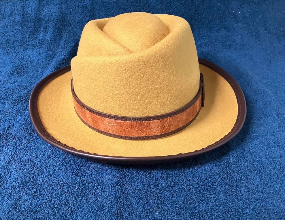 This is a new hat and has never been worn. It is in a plastic bag with a protective band of styrofoam around the faux leather band of the hat. The inside circumference of hat is 24"-25" Made of felt Mustard yellow with a 2 toned brown faux leather band Brim has faux leather trim