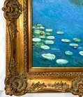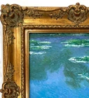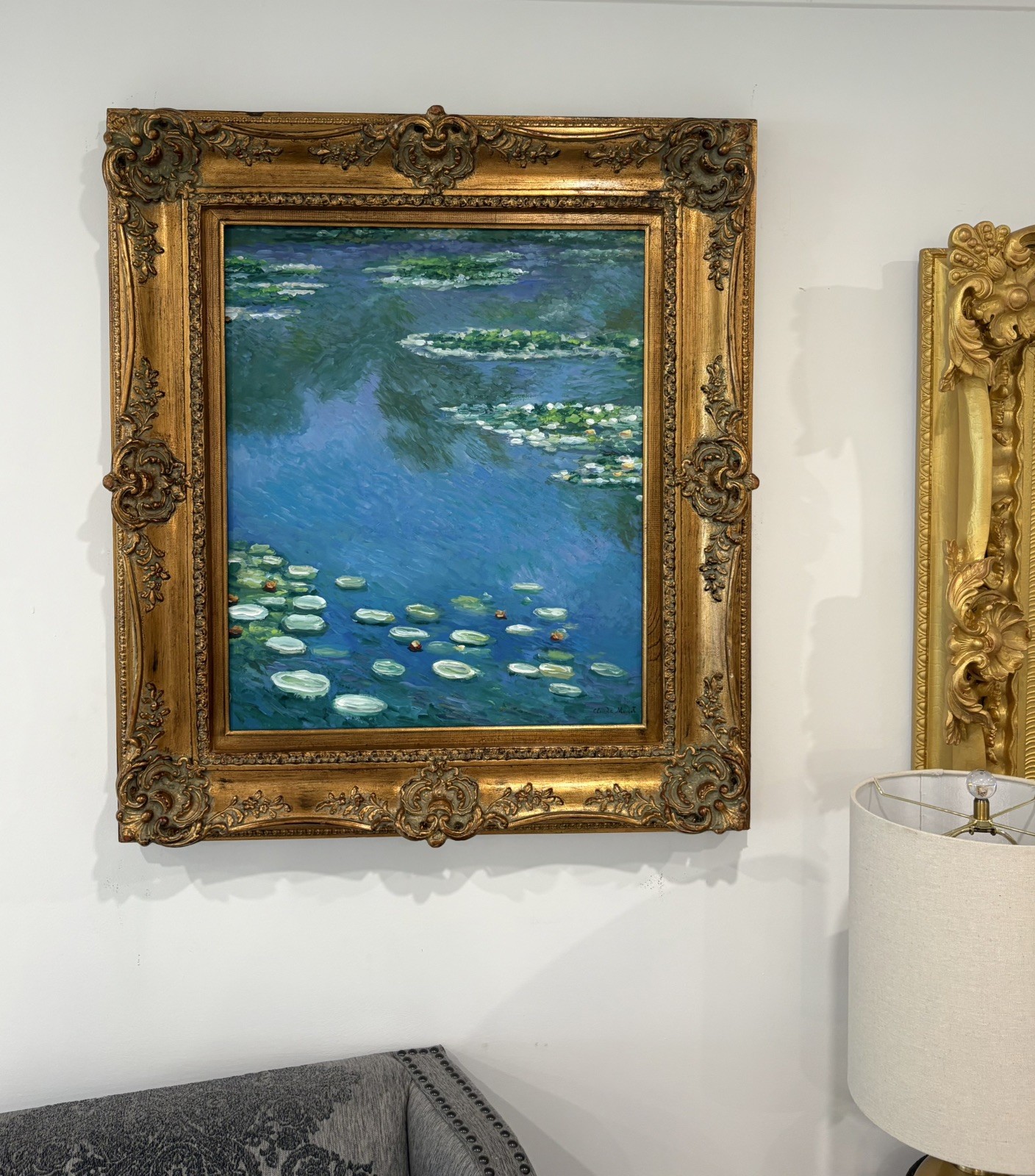 Oscar-Claude Monet Oil on canvas style of painting Monet was a French painter and a key figure in the Impressionist movement. His work, characterized by bright colors, light brushstrokes, and uncluttered nature, revolutionized modern art. Monet was a prolific practitioner of Impressionism's philosophy of capturing one's perceptions of nature, particularly through plein-air landscape painting. He often painted outdoors, directly on compositions he would later revise in his studio. Please Note: This beautiful art work is sold as Attributed to the artist. Image size 24 x 20 inches frame size 33 1/2 x 29 3/4 inches