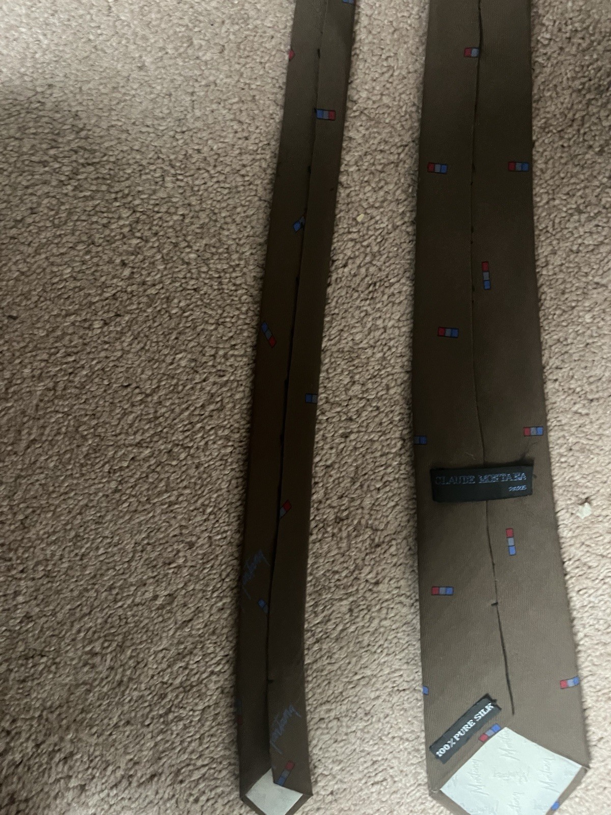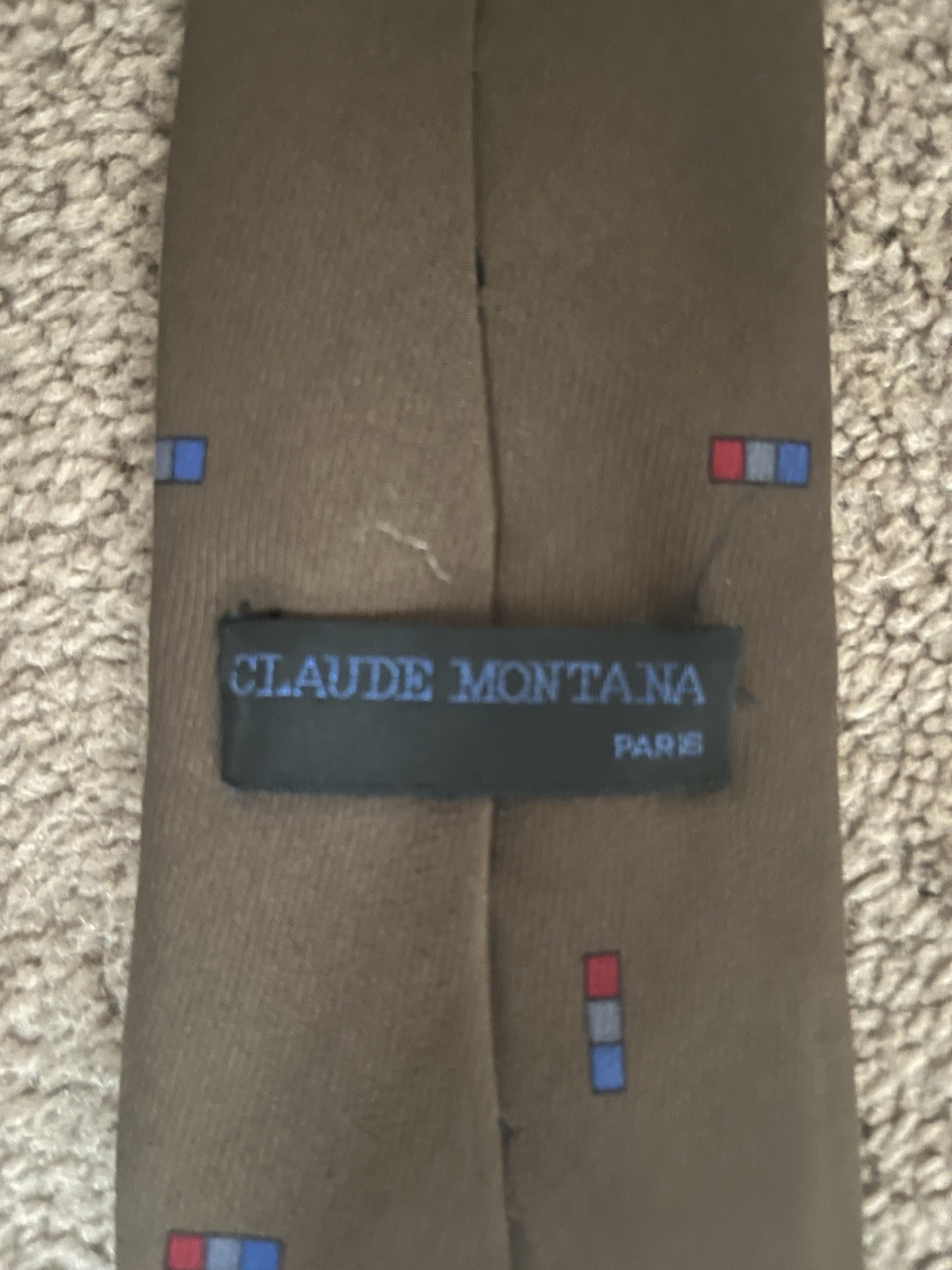The Claude Montana Tie is a luxurious accessory crafted from 100% silk, featuring a classic geometric pattern in a stylish brown color. This designer tie, suitable for men, has a vintage appeal with the inclusion of the Claude Montana logo as accents. The one-size design offers a classic length and width, making it versatile for various occasions and easy to add a touch of sophistication to any outfit. The adjustable feature ensures a comfortable and secure fit for the wearer.