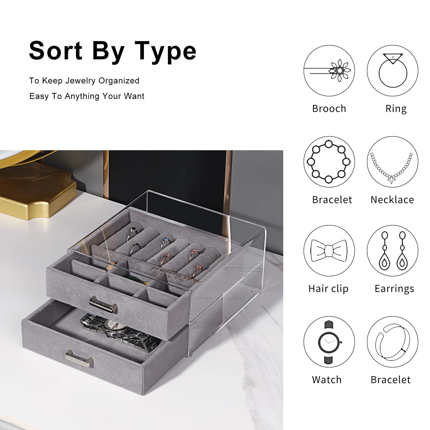 Jewelry Box ✅[SIMPLE DESIGN]: Designed with 2 tiers of removable drawers that slide smoothly and metal handles are very easy to grab and pull out. Transparent acrylic exterior allows you to easily see where your jewelry is placed and easy to access, Acrylic box with printed gold LG on top. ✅[ACRYLIC MATERIAL AND VELVET LINING]: Love every women's health, acrylic material is also eco-friendly, The acrylic case is always ready to be taken to the cleaners, when you place your items inside the velvet tray, you will find a velvet liner inside that prevents scratches and damage to your jewelry. ✅[VERSATILE]: Each drawer tray has a different divider design to store different sizes of jewelry, Small sized jewelry such as earrings, rings, necklaces, studs; large sized jewelry such as watches, bracelets and brooches; all jewelry can be perfectly protected in this oversized organizer. ✅[PERFECT GIFT AND SIZE]: This organizer is a perfect gift for mothers, girlfriends, wives, daughters, coworkers, friends or other special women in your life. (Product size 5.7x6.1 x 3 in high ) 0.93 pounds (lb) ✅ [AFTER SALES AND COMPANY VIEWPOINT]: We provide product quality guarantee, If you are not satisfied with your purchase for any reason within 30 days, please feel free to contact us - Tell everyone to believe in love, everyone's life must be full of sunshine vitality, Also for every family are happy, healthy, happy life.