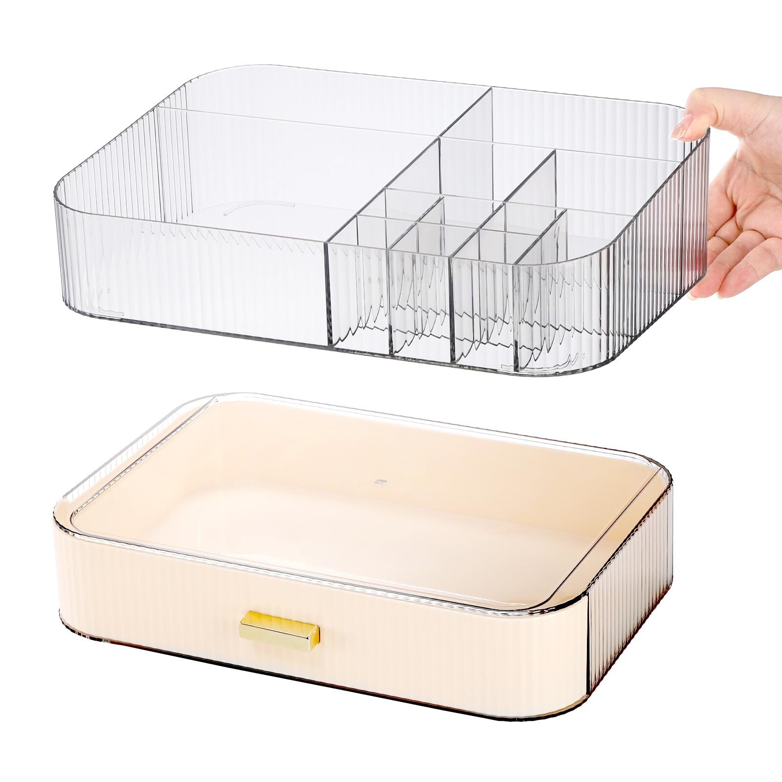 Clear Makeup Organizer with Drawer, Skincare Cosmetic Storage Display Case for Vanity, Stackable Bathroom Perfume Countertop Dresser Top Organizer for Lipsticks, Beauty Products Product Details Specific Uses For Product: Cosmetics, Cleaning Supplies Material: Polyethylene Terephthalate Special Feature: Stackable, Dustproof, Adjustable Color: Clear Brand: Acshio Product Dimensions: 11.8"D x 7.87"W x 5.5"H Shape: Rectangular Number of Items: 1 Manufacturer: Acshio Product Dimensions : 11.8 x 7.87 x 5.5 inches; 3.13 Pounds Item model number : Ac-ClearMakeupOrganizer-Drawer Manufacturer : Acshio Country of Origin : China Stackable Design: You can stack the makeup organizer as a whole or separate them for different places. The top slot compartment keeps items upright and clearly visible for your convenience. Compartmented Storage: Includes a top tray organizer and a drawer, the organizer has 12 compartments for different sizes of cosmetics, lipsticks, perfume, brushes, and the drawer can store face masks, cotton pads, eyeshadow palettes, and other daily cosmetics. High Quality Material: Acshio vanity storage is made of high quality PET material, BPA-free, dustproof and waterproof, which can effectively protect your cosmetics. Exquisite Appearance: Chic and elegant appearance creates a visually appealing display that matches perfectly with most decorative styles. This organizer can be placed on bathroom countertops, vanities, desks, office desks or anywhere you choose and looks very elegant. Perfect Gift: The clear cosmetic organizer is a perfect gift for girls, daughters, friends, makeup lovers. It is also a great gift for Mother's Day, birthday, wedding, Valentine's Day, Christmas, housewarming.