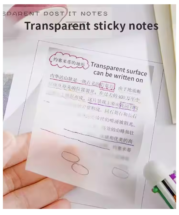 • High Quantity :With 250 pieces per pack, this memo pad provides ample supply for both school and office use. 250PCS PET Transparent Sticky Notes Perspective Waterproof Clear Fluorescence Memo Pad Stationery School Office Supplies • Waterproof Material :The PET material of these sticky notes ensures they are waterproof, making them durable and long-lasting. • Fluorescence Design :The clear fluorescent design of these notes makes them highly visible even in low light conditions. • Versatile Use :Ideal for jotting down reminders, marking pages, or leaving messages, these notes offer versatile usage. • Transparent Sticky Notes :The transparent sticky notes do not obstruct visibility, making them discreet and convenient for note-taking
