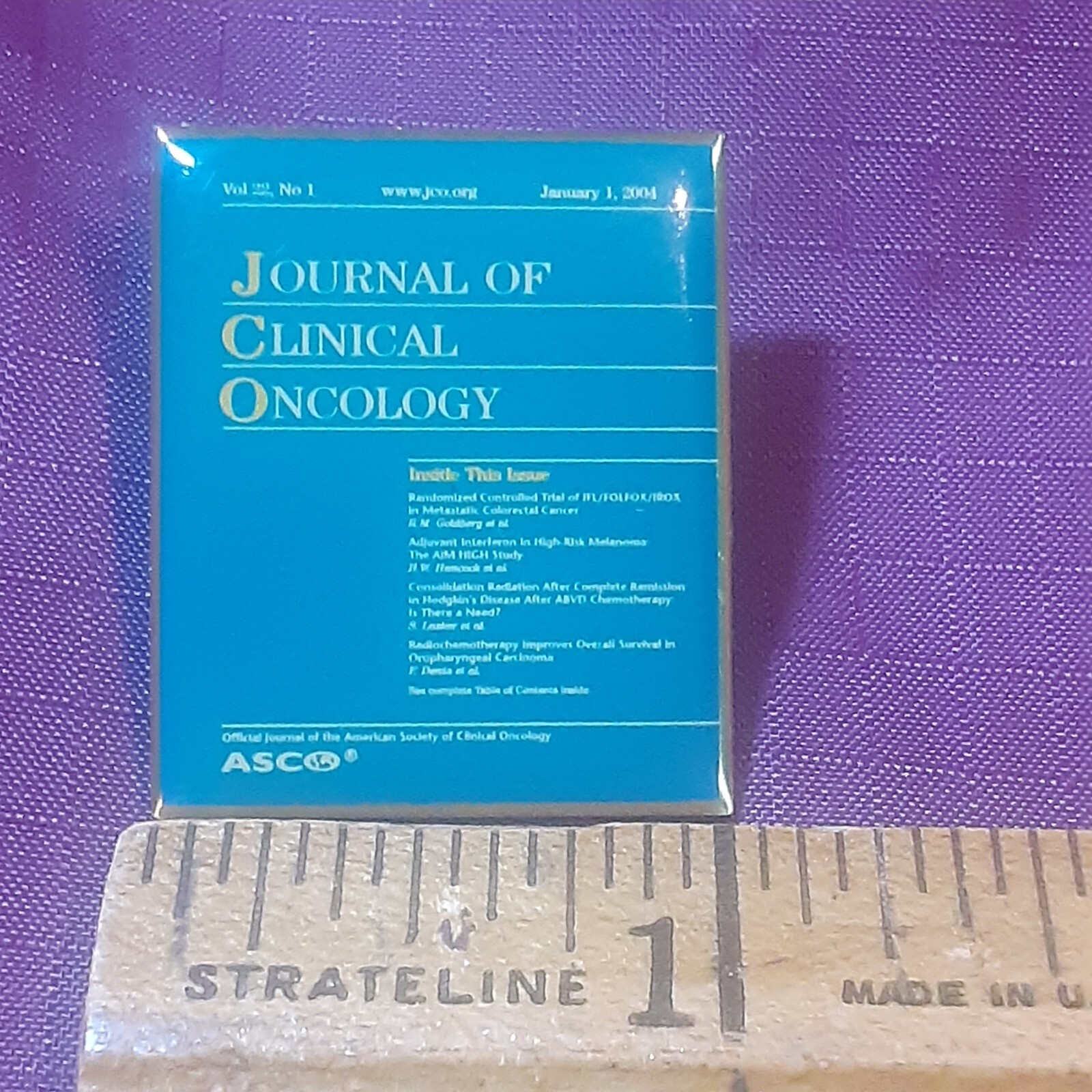 This is a pin featuring the cover of the January 2004 issue of the Journal of Clinical Oncology. It would make a great addition to any collection of pinbacks, especially for those interested in medical journals or oncology. The pin is in good condition and ready for display.