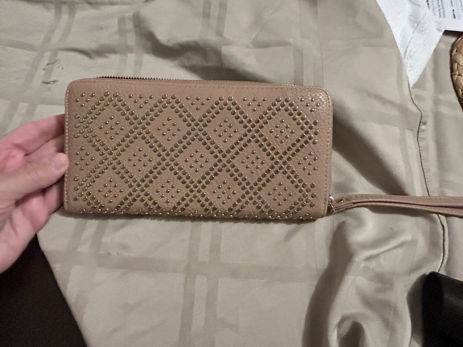 This stylish clutch is perfect for any fashion-forward woman looking to add a touch of edginess to her outfit. The studded accents give it a unique and eye-catching look that is sure to turn heads. It's a great addition to any wardrobe and can be dressed up or down for any occasion. With a convenient size and sleek design, this clutch is perfect for carrying your essentials on the go. The pre-owned status does not detract from its beauty and functionality. Whether you're heading out for a night on the town or simply running errands, this clutch is a must-have accessory.