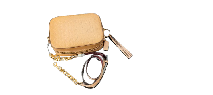 Elevate your everyday style with this beige Coach crossbody bag from the Kristin collection. Crafted with premium coated leather, the bag boasts a sleek and durable exterior, perfect for casual occasions. The semi-circle shape and brown leather shoulder strap provide a comfortable carry that's both stylish and practical. The bag features a brown lining with inner pockets and a dedicated slot for your checkbook, ensuring your essentials are organized and within easy reach. Brass hardware adds a touch of elegance to the overall design. With its minimalist aesthetic and subtle Coach branding, this bag is a versatile accessory for any wardrobe.