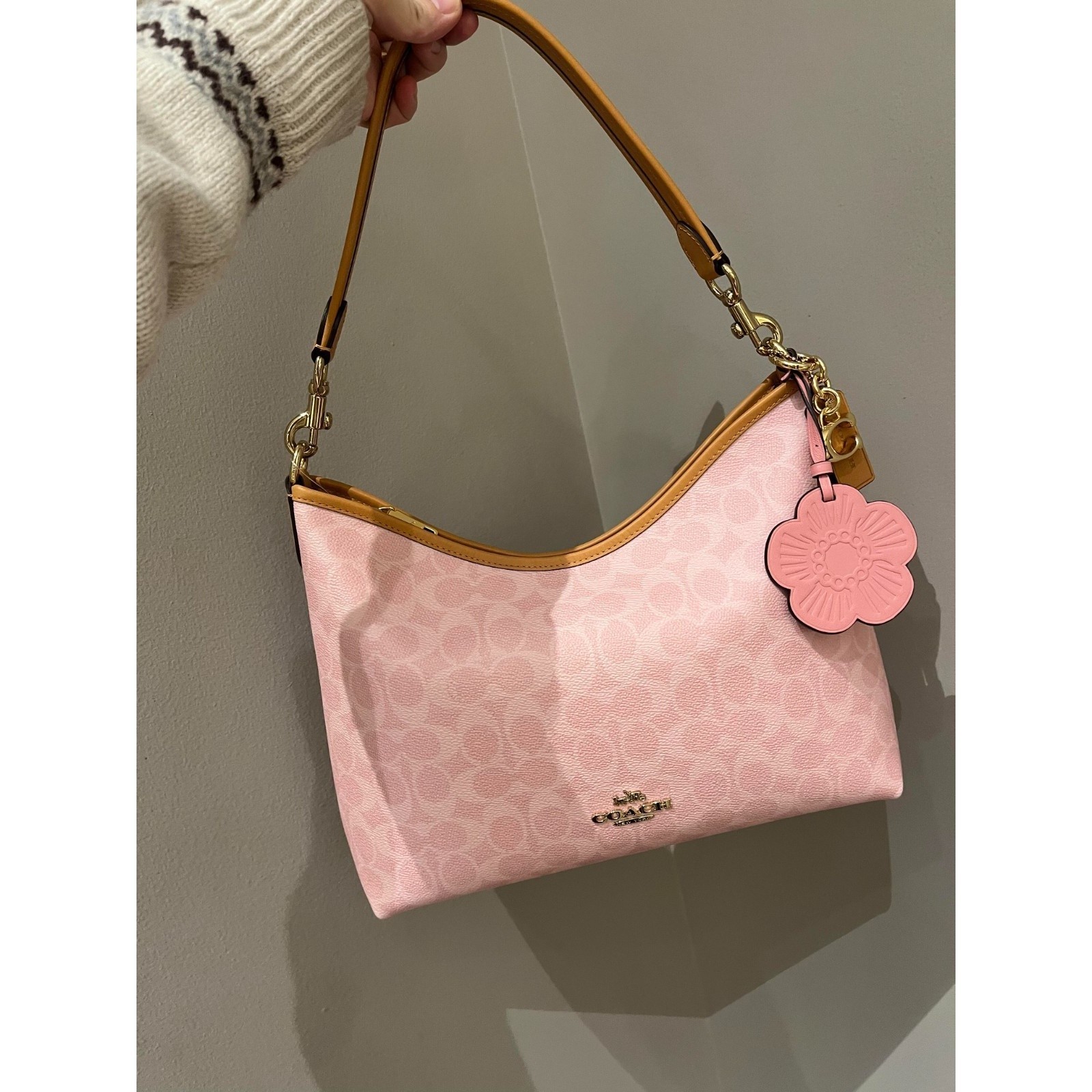 Measurements Length: 12.25" Height: 9.25" Width: 4.25" Materials Signature coated canvas, smooth leather and vachetta leather Recycled polyester lining Handle Detachable handle with 11" drop Strap Detachable strap with 22" drop for shoulder or crossbody wear Features Inside zip and snap pockets Zip-top closure Elevate your accessory collection with the Coach CEL12 Laurel Shoulder Bag, a harmonious blend of elegance and practicality. Crafted from luxurious leather and featuring the iconic Coach signature canvas, this shoulder bag comes in a chic gold and powder pink color combination, perfect for adding a touch of sophistication to any outfit. The bag measures 12.25" in width and 9.25" in height, providing ample space for your essentials.Designed with versatility in mind, the bag includes a cross-body strap and a zip closure to keep your belongings secure. The package also boasts a charming bag charm accessory and a certificate of authenticity to assure you of its quality and authenticity. Whether you're stepping out for a casual day or an evening event, the Coach Laurel shoulder bag from the Coach Outlet product line is an impeccable choice for the modern woman.