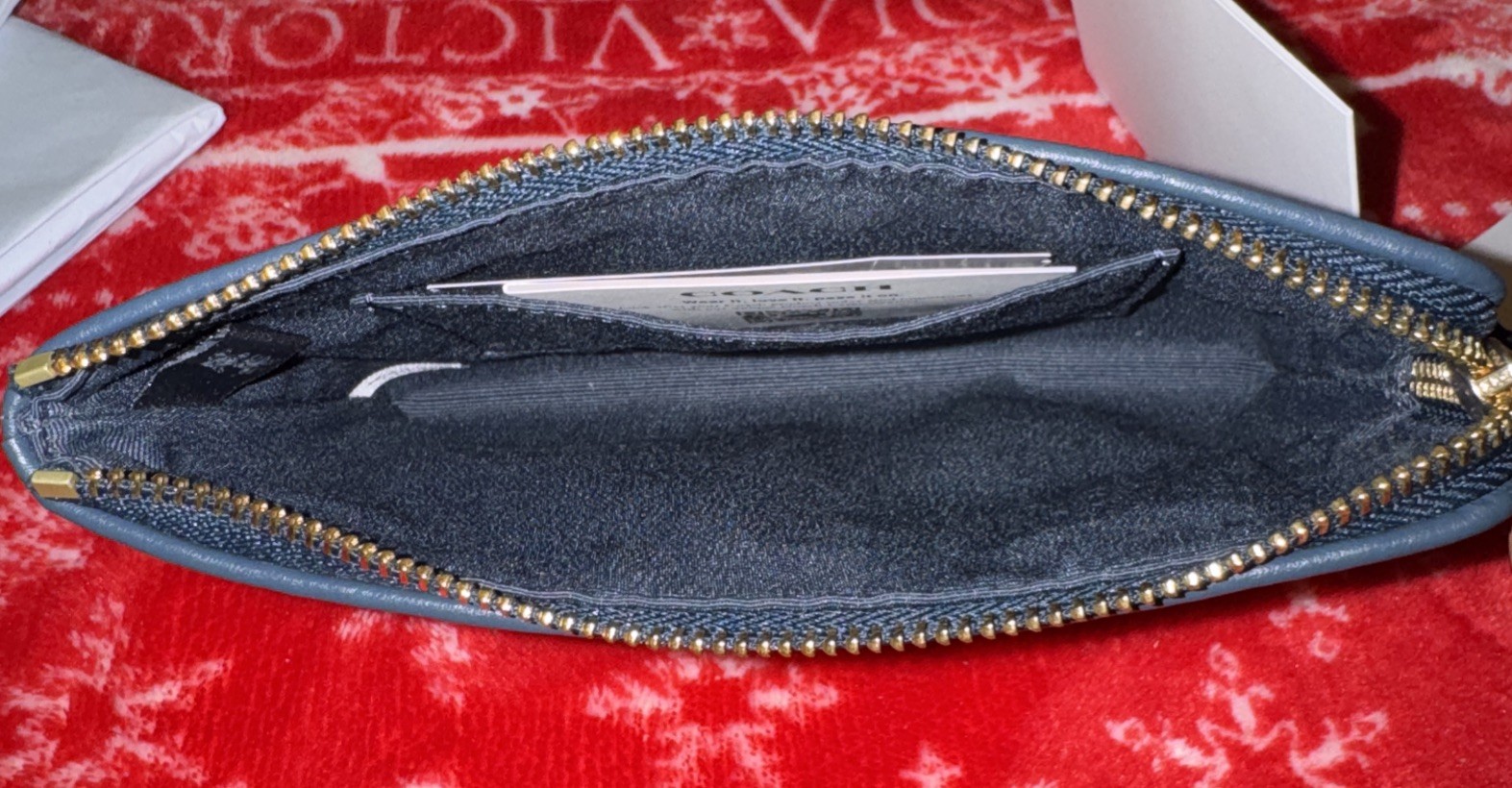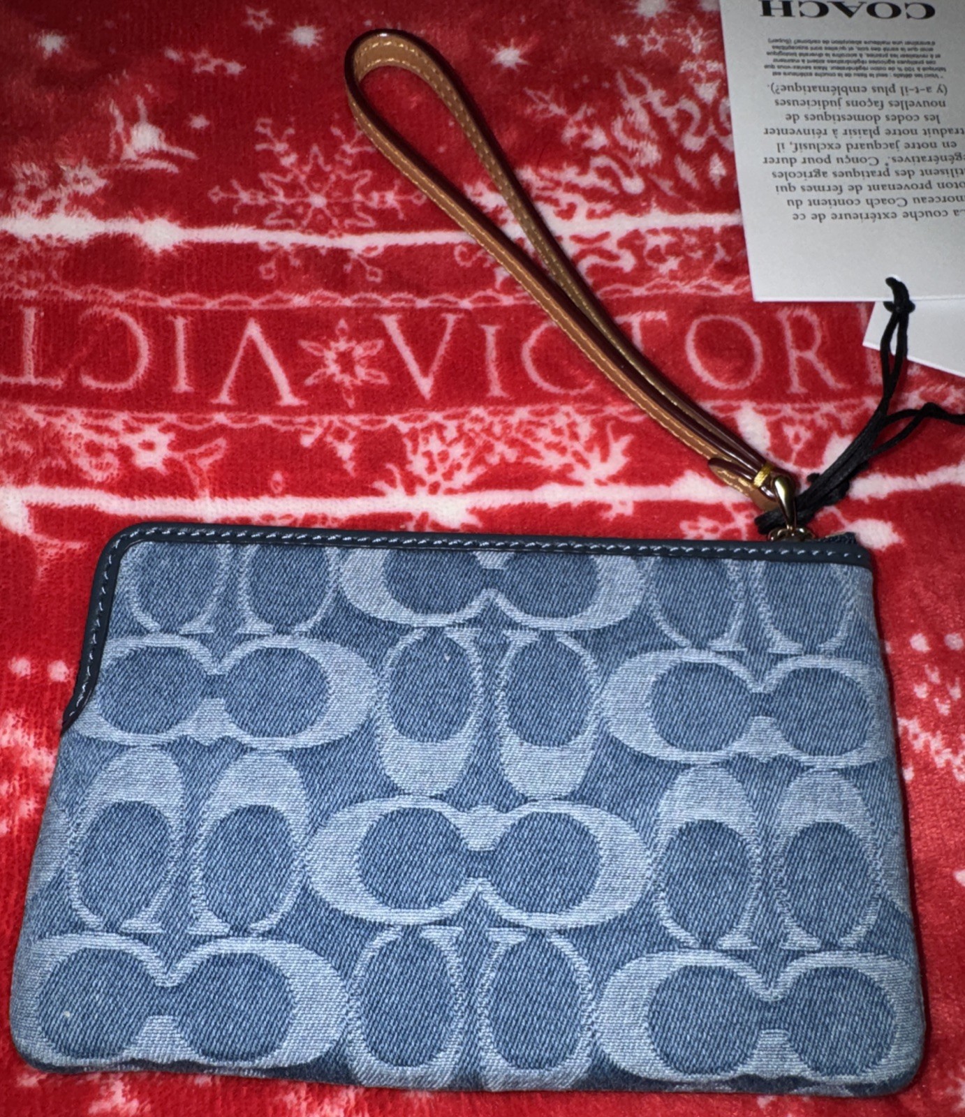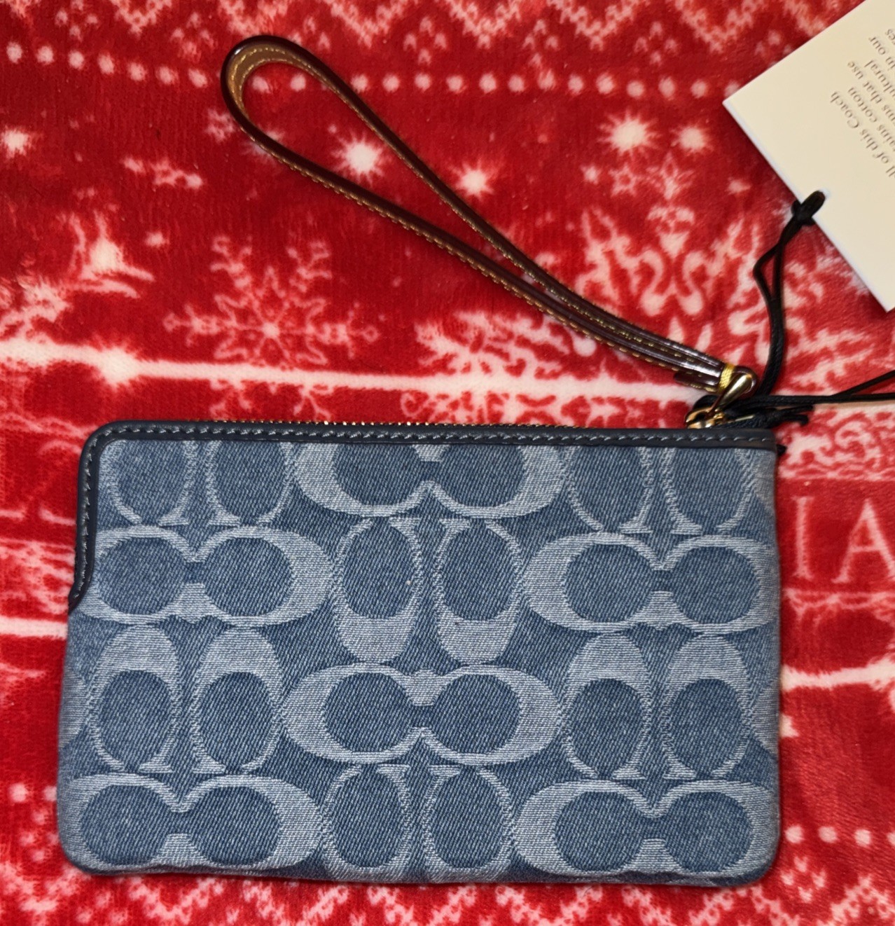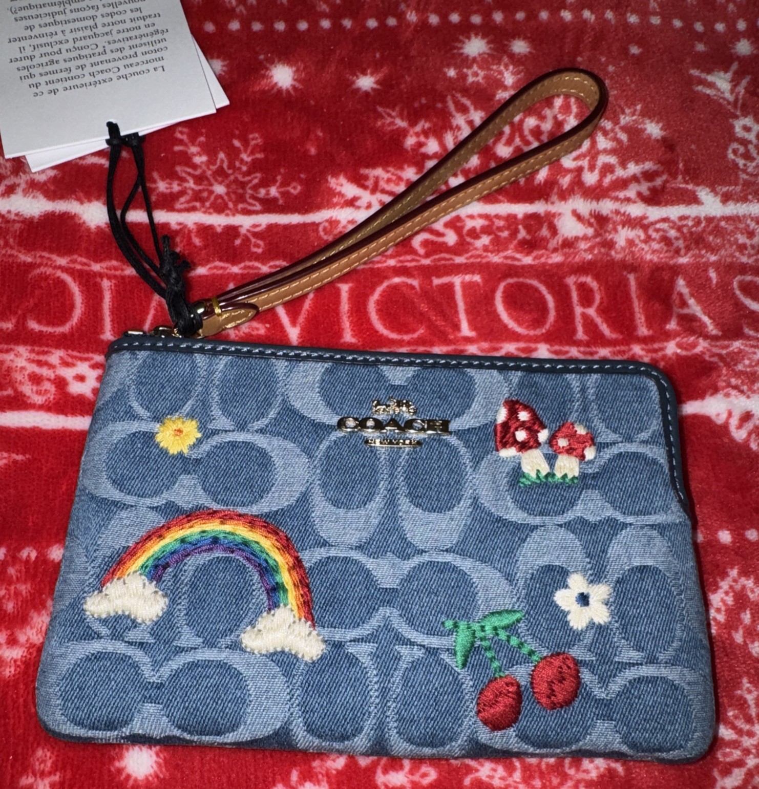 The Coach Corner Zip Wristlet in Signature Denim with an Embroidered Pattern is a stylish and versatile accessory for women is too cute. Made of signature denim, vachetta leather, and smooth leather, this wristlet features an embroidered pattern with cherry, mushroom, flowers, and rainbow accents. It includes a credit card holder and has a fabric lining for added durability. The blue color and one-size design make it a perfect addition to any outfit, while the designer limited edition theme adds a touch of luxury to your everyday look.