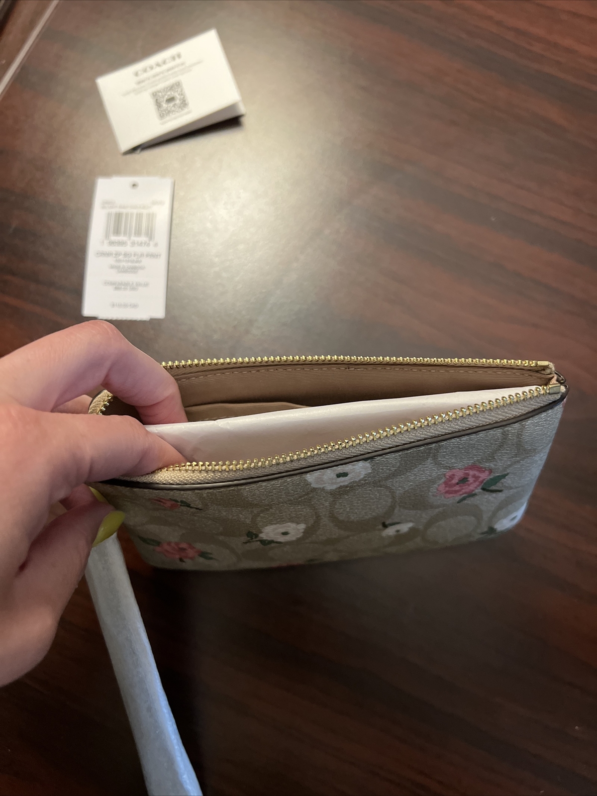 This Coach wristlet is a must-have accessory for women who want to keep their credit cards organized. The gold and light khaki multi-color design is eye-catching and stylish. The signature canvas material is durable and long-lasting, ensuring that this zip-around wristlet will be a reliable accessory for years to come. The ditsy print adds a touch of nostalgia to the design. This one-size wallet is suitable for any woman who wants to stay organized and look good at the same time. The wristlet has a simple and elegant design that is perfect for any occasion, whether you're heading out for a night on the town or just running errands. The wallet features credit card slots that keep your cards secure and easy to access.