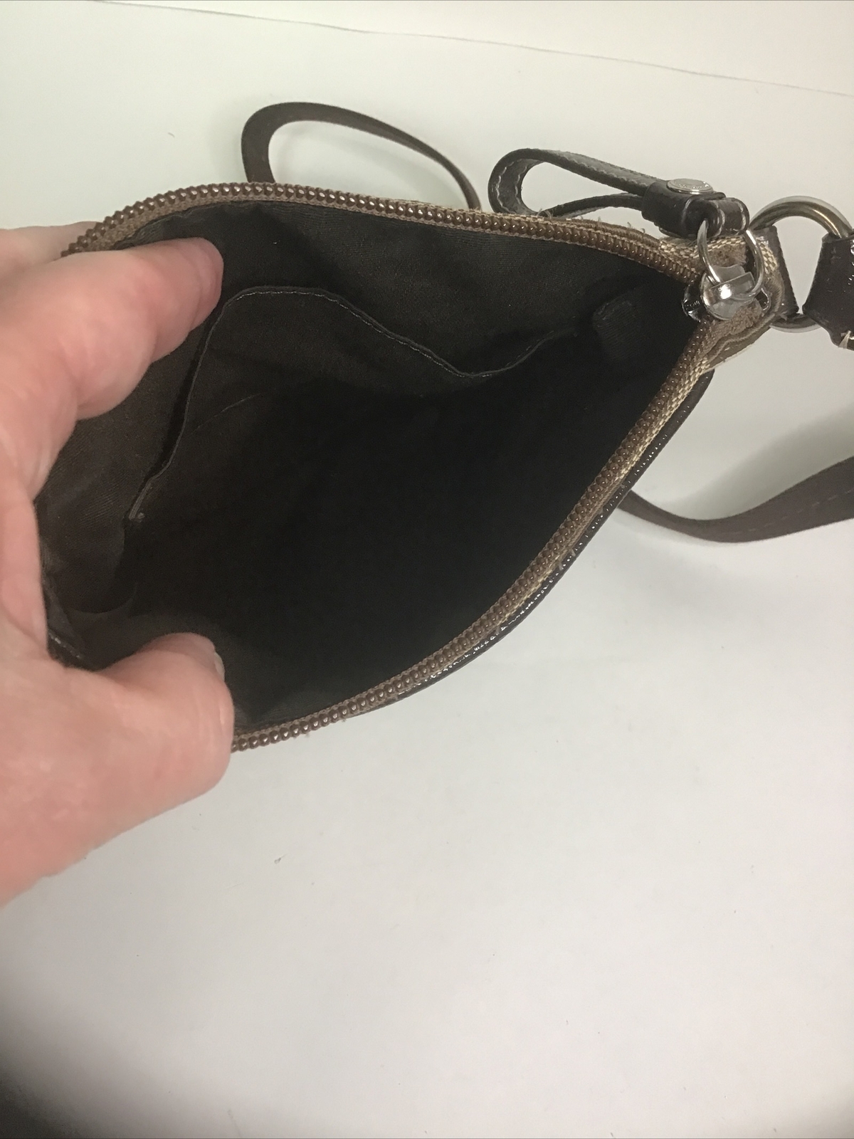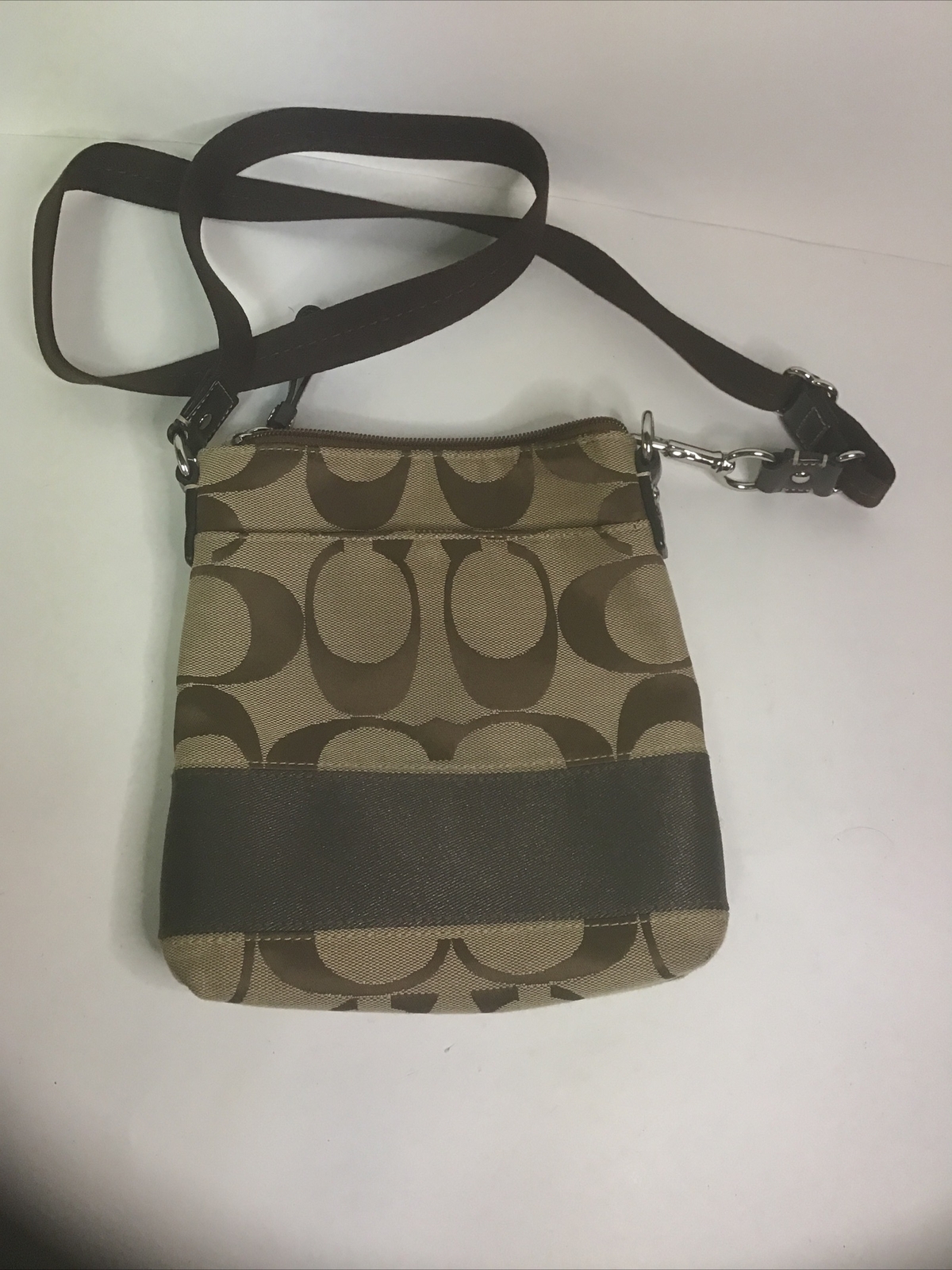 Coach Crossbody Bag. 9x8. one inside pocket and two outside. Tan with brown logo.