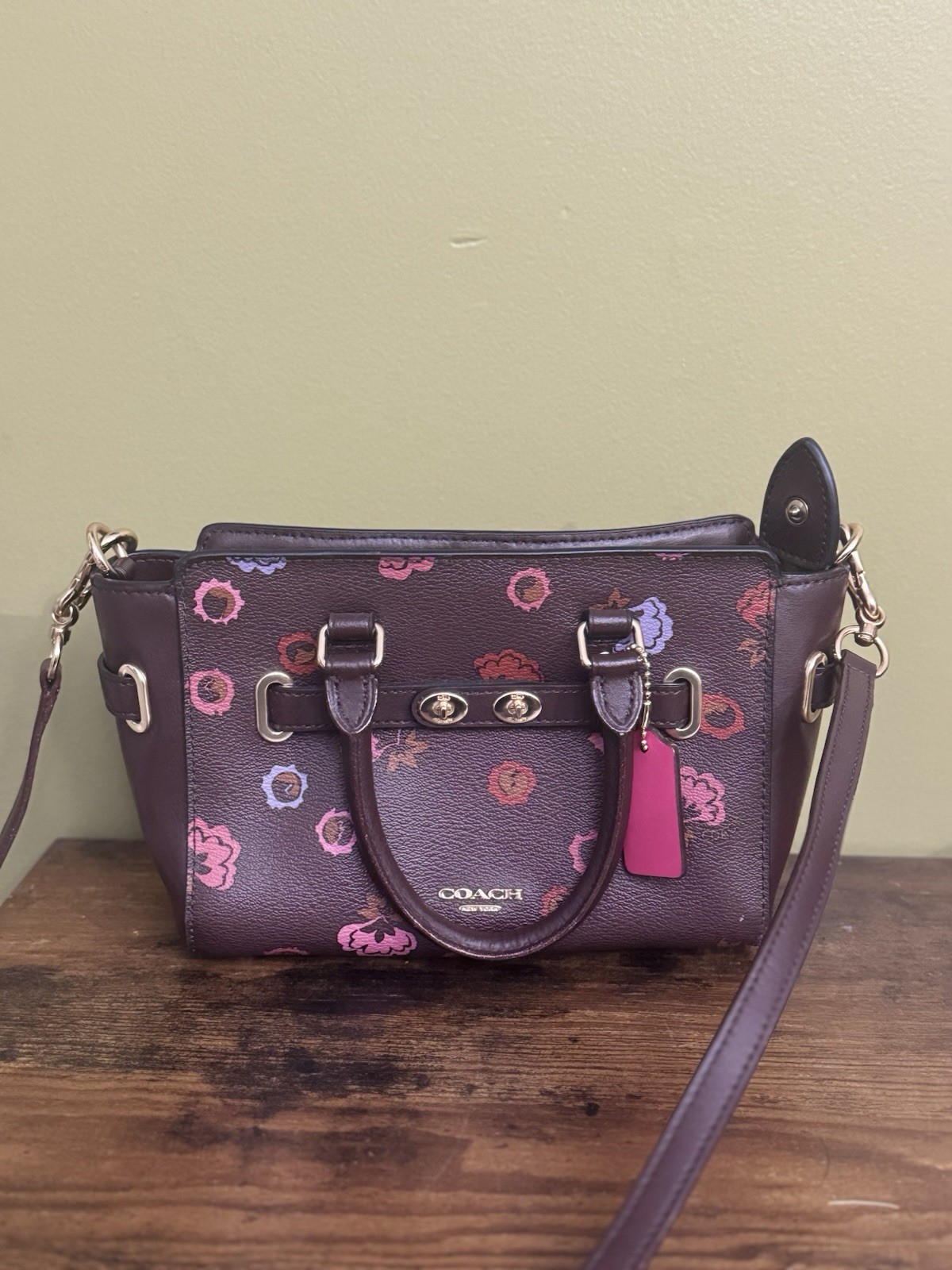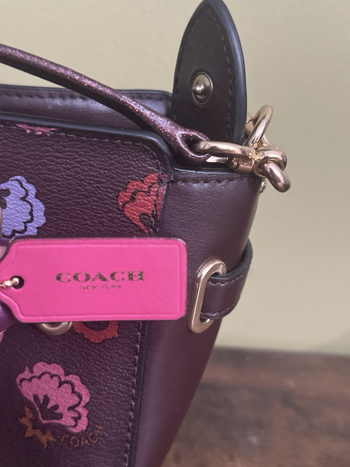 The Coach Crossbody Purse in burgundy leather with a floral pattern is a stylish and practical accessory for women. The rectangular shape and zip closure make it easy to carry on the go, while the crossbody strap adds a trendy touch. The adjustable strap ensures a comfortable fit, and the zipper accents add a functional element to the design. Perfect for everyday use, this Coach purse combines fashion and functionality seamlessly.