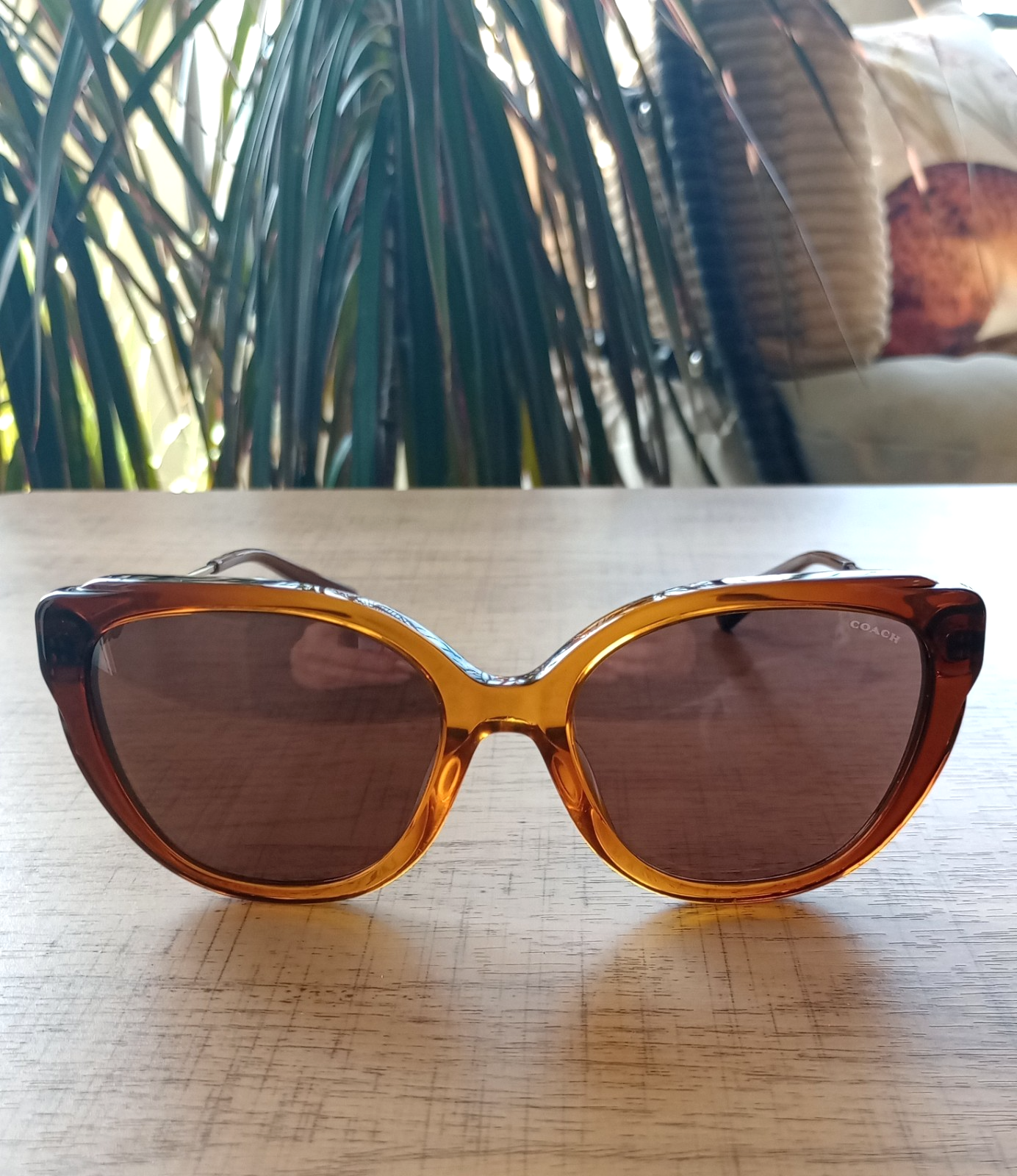 Embrace the fusion of luxury and style with these Coach Women's Sunglasses. Sporting a chic Simi Cat-Eye silhouette, these sunglasses are designed to complement a variety of face shapes. The transparent amber frame adds a touch of sophistication, while the smoke-tinted polycarbonate lenses offer both fashion and function, blocking UVA and UVB rays. Crafted from a blend of durable acetate and metal, these sunglasses are oversized for a statement look that's not too overwhelming. The lightweight design ensures comfort, making them ideal for everyday wear or any outdoor activity. The tinted lens technology sharpens your vision, all while keeping you in step with the latest designer theme. 55-18-140 Coach case, cloth, and paperwork included