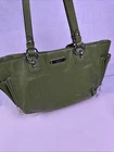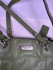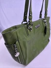 Coach Gallery Zip Tote Green Leather Shoulder / Tote Bag, model F19252 Key Features and Information: Design: This tote features a secure zip-top closure and multiple pockets for organization, including an outside zip pocket for easy access to essentials like a phone or keys. Material: It is crafted from leather, specifically mentioned as crossgrain leather in some newer versions or soft-yet-durable pebble leather in others, and has a fabric lining. Capacity: The spacious interior is designed to fit a 13" laptop, along with other daily essentials, making it suitable for work or travel. Style: It serves as a versatile everyday bag with a minimalist yet stylish aesthetic, combining practicality with a sleek look. Condition: the leather, zippers, handles and hardware are in excellent condition. The interior fabric needs to be cleaned and there are a couple of smudges on the front. Please see pictures