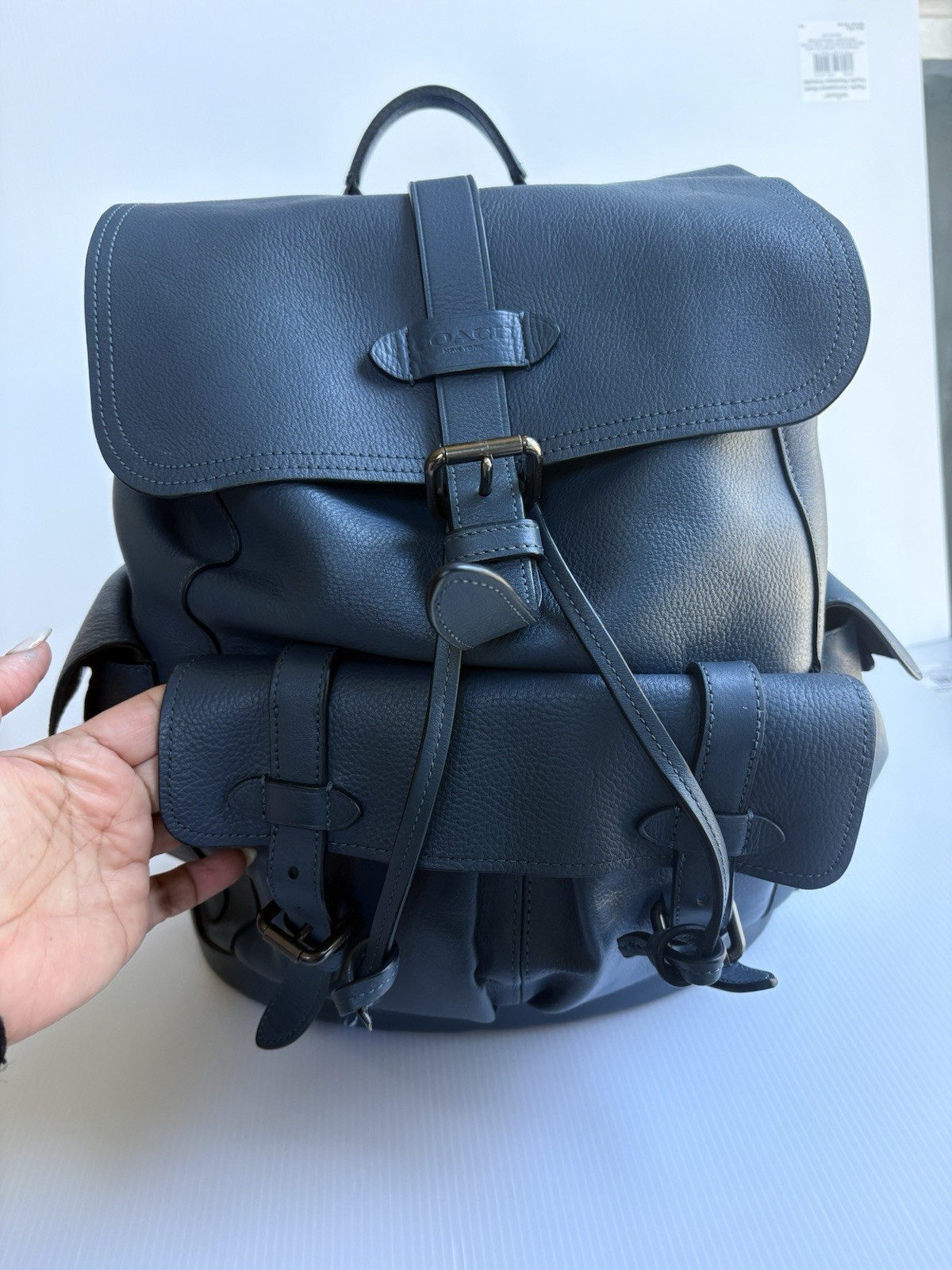 Coach Hudson Leather Backpack, a functional and premium accessory crafted from high-quality pebbled leather. The specific model is often identified by the style number F23202 and features a distinctive teal or cobalt blue color. Key Specifications Dimensions: Approximately 12.5" (L) x 16.5" (H) x 5.5" (W). Interior Features: Includes a zip pocket, cell phone pocket, multifunction pockets, and a dedicated laptop sleeve. Exterior Design: Features drawstring and snap closures with a flap top and multiple external buckle-accented pockets for extra storage. Excellent condition Teal blue Leather
