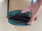 This Coach crossbody bag is a stylish accessory for any woman. The deep green leather exterior is accented with black leather handles and gold hardware. The bag measures 8 inches in width and 6 inches in height, making it the perfect size for everyday use. The interior lining is gray, and there is enough space to hold all your essentials. This bag is perfect for any occasion, whether you're going to work or out with friends.