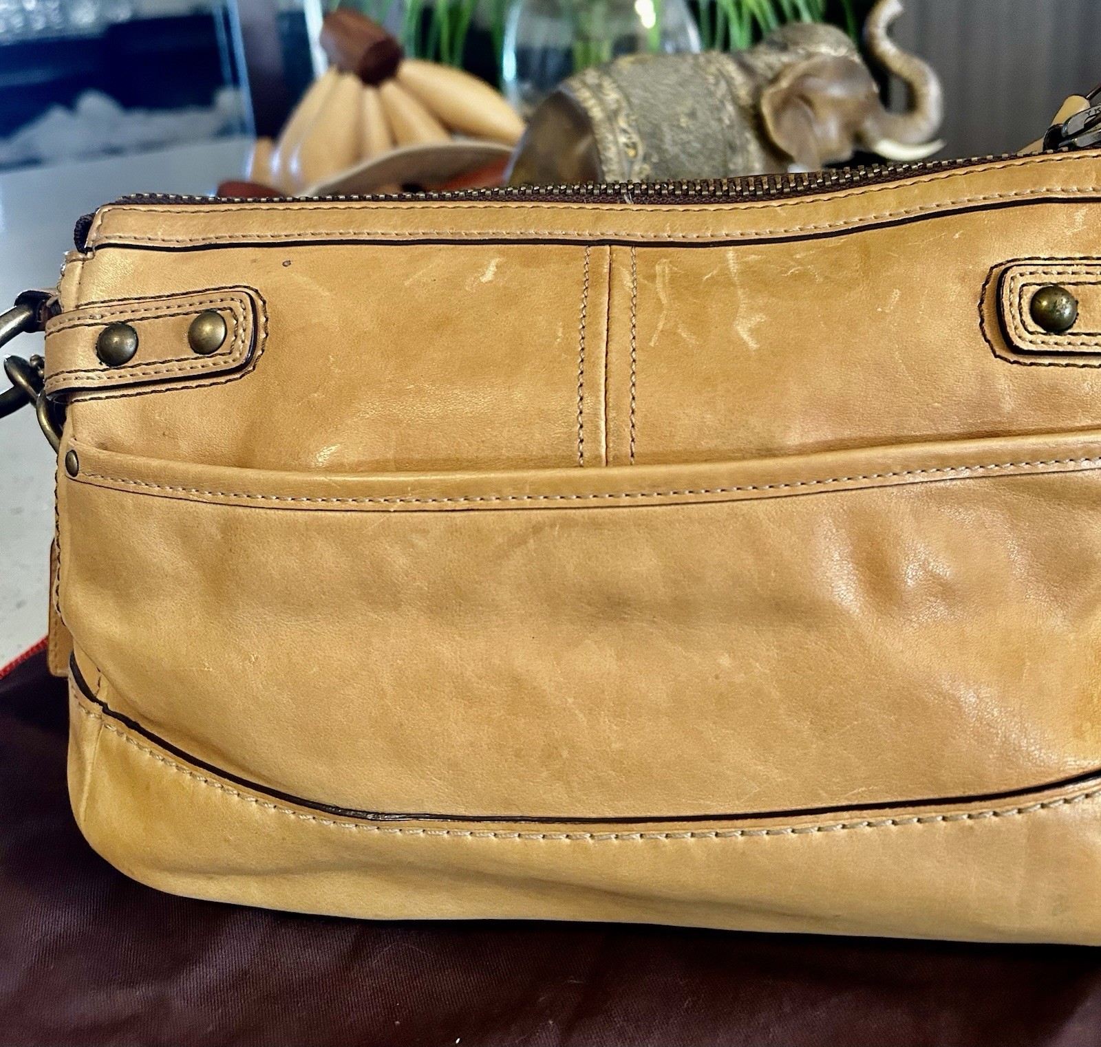 The Coach Legacy 11127 Camel Vachetta Leather Shoulder Bag is a vintage piece commemorating the brand's 65th anniversary. This medium-sized rectangular bag features a turn lock closure, gold hardware accents, and a light brown distressed leather exterior. The adjustable shoulder strap adds comfort and versatility to the classic shoulder bag style. Perfect for a business occasion or everyday use, this limited edition Coach bag is adorned with a buckle accent and a bag charm, making it a stylish and practical accessory for any woman's wardrobe. Please Zoom in all the pictures and inspect them thoroughly.. This particular purse has no holes , scuff , no odors ,, The purse is a Vintage ( Not New) .. The purse is for sale As is .. Thanks for stopping by … !!!