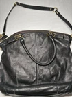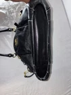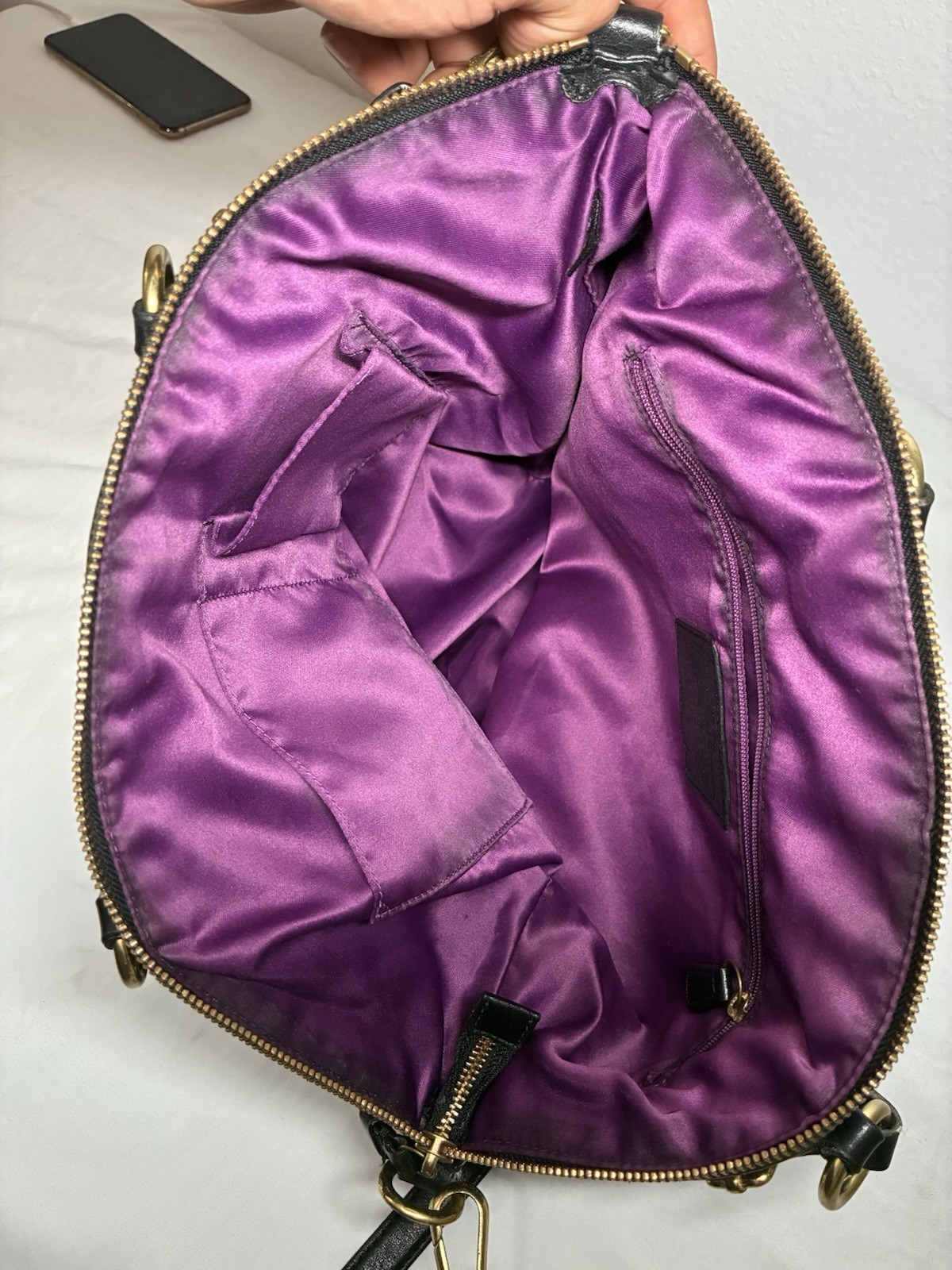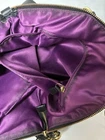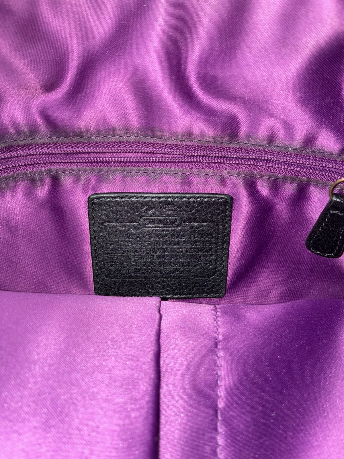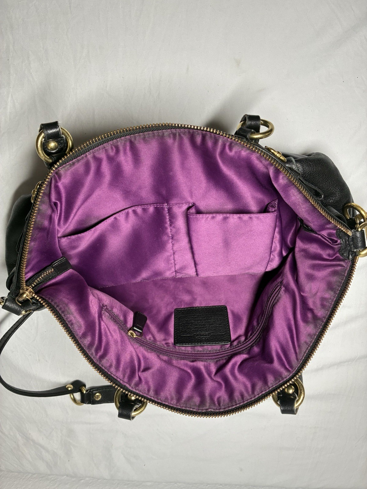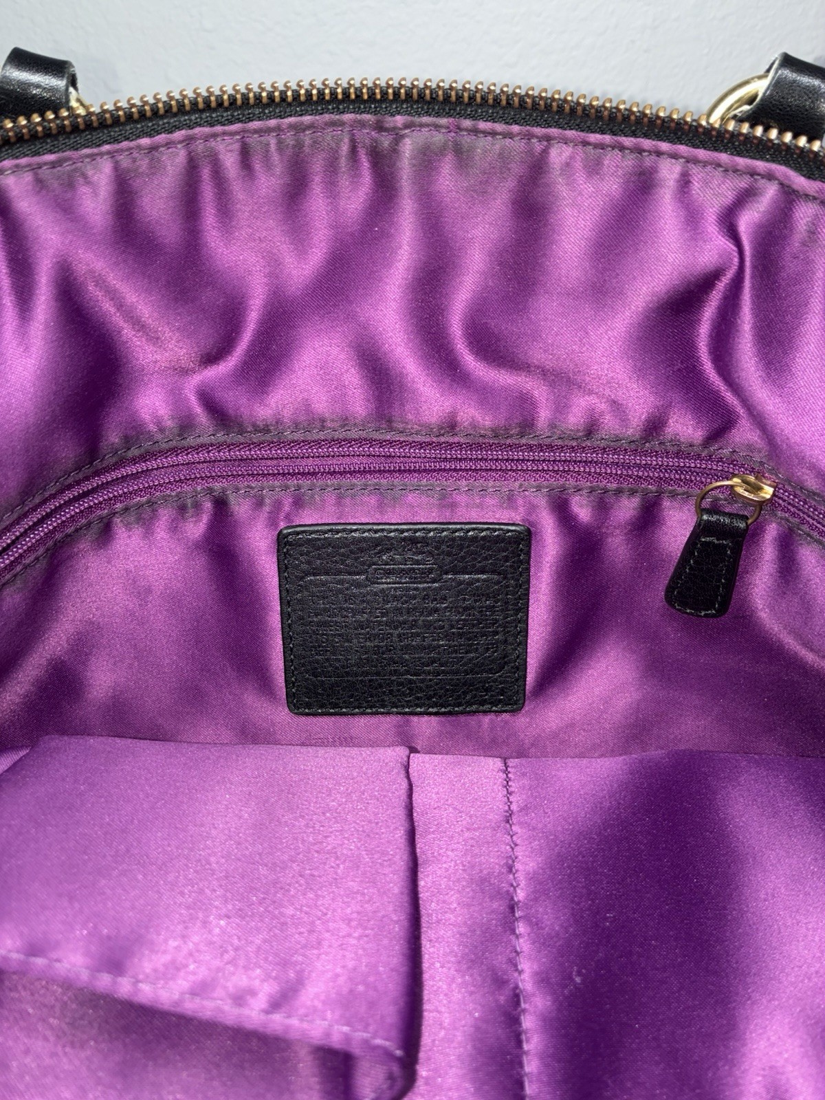 The Coach Madison Maggie Satchel 18632 in black pebbled leather with a purple lining is a stylish shoulder bag designed for women. This sophisticated handbag features a purple satin lining, nickel hardware accents, and a convenient zipper closure. The Coach brand is known for its quality craftsmanship, making this bag a timeless and fashionable accessory for any outfit. The pebbled finish adds a unique touch to the classic black exterior, making it a versatile choice for everyday use.