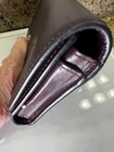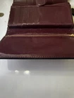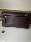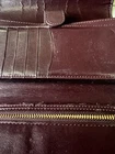 This Coach NY Trifold Wallet is a stylish accessory for women. It is made of high-quality leather in a beautiful brown color. The wallet features a solid pattern with a logo theme and comes with a coin pouch and hooks for attaching a chain. It has a zipper closure and is convertible to a crossbody style. The wallet is handmade and has a length of 9 inches. It is perfect for carrying credit cards and folding money. The item is preowned and has been well-maintained with a small amount of peeling on one edge. Great value for the expense. No returns.