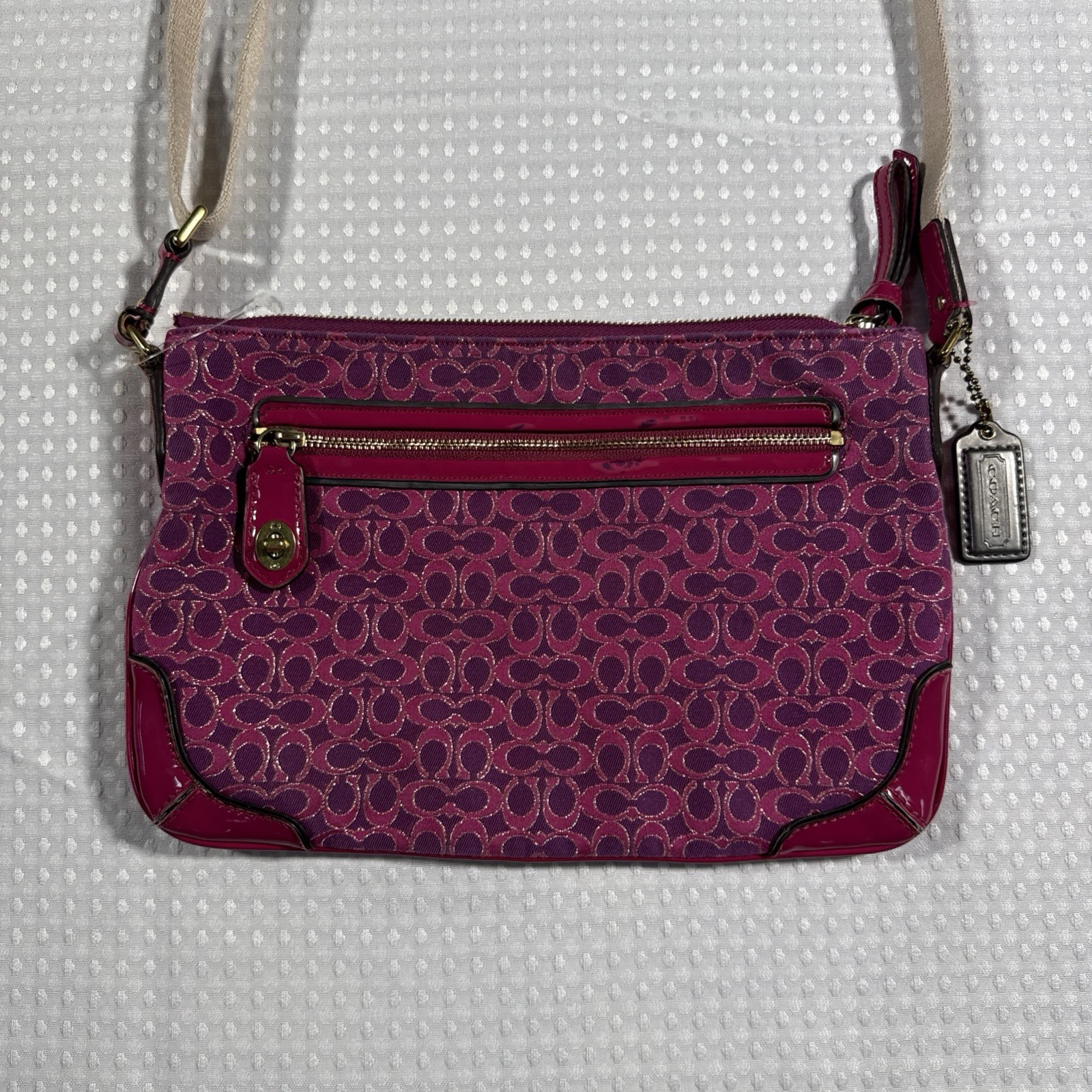 The Coach Crossbody Bag in pink and purple is a stylish and versatile accessory for women. Made with a combination of canvas and nylon, this crossbody bag features a vibrant pink exterior color with hardware accents in pink as well. The purple handle/strap adds a pop of color, while the purple lining provides a subtle contrast. This trendy bag is perfect for on-the-go use, offering both fashion and functionality in one chic design. Bag has a few small blemishes as shown in the photos. Please see all photos before purchasing. A41