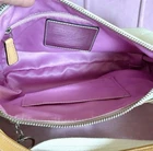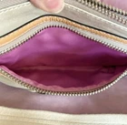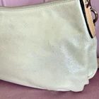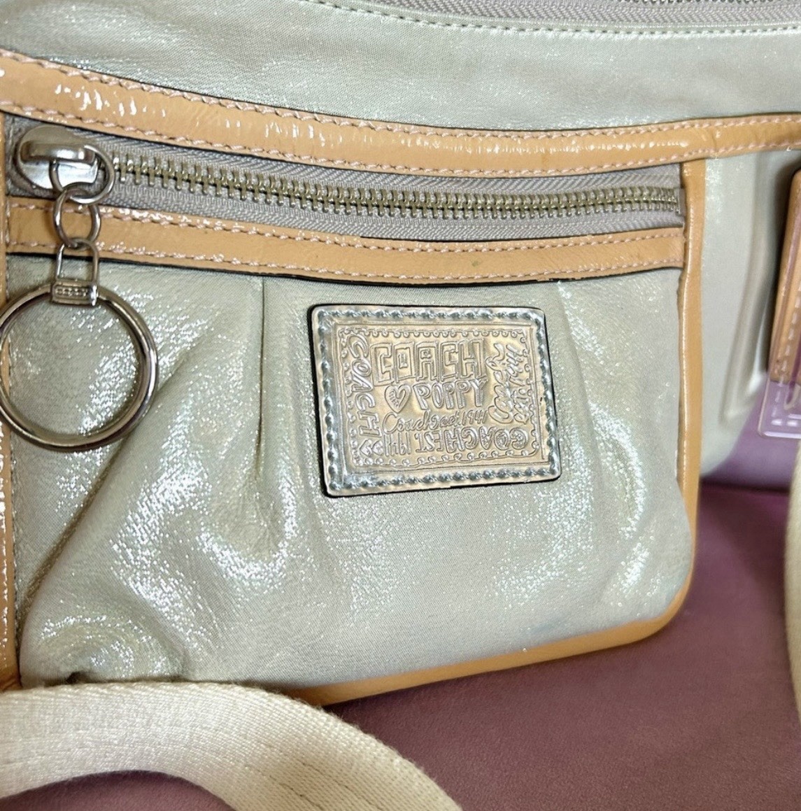 Coach Poppy Sparkle Groovy crossbody bag, silver-white with peach-toned patent leather trim, top zipper closure, one hanging zipper outside pocket on front, patent leather trim shoulder strap and soft material crossbody strap. One zipper and one open pocket inside. There are few spots on the back of the bag, otherwise is in excellent condition!