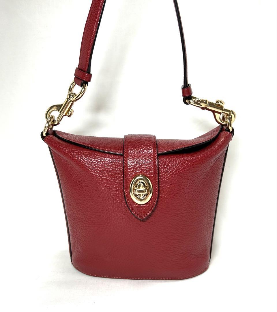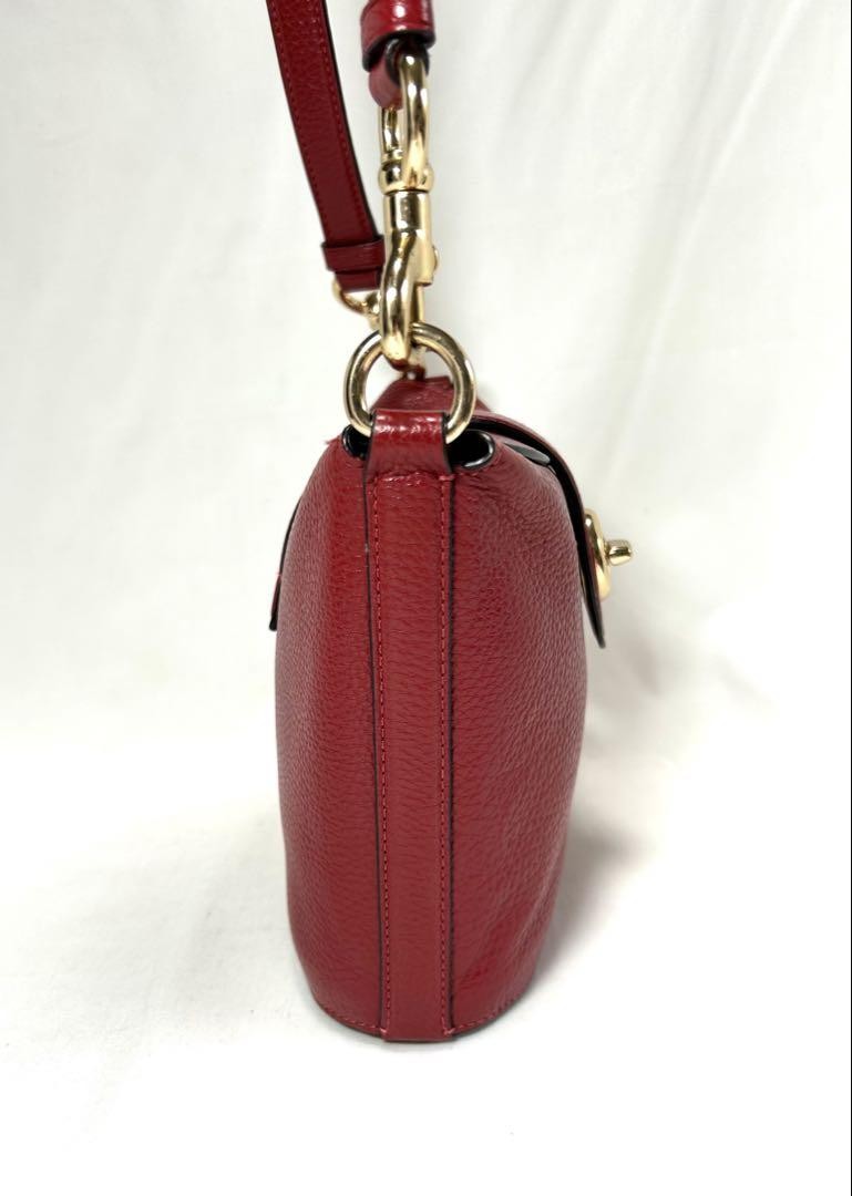 The COACH shoulder bag is a turnlock model, specifically the NOTTINGHAM BAG, model number C2814, and comes in red. The bags height is 6.3 inches, the width is 8.27 inches at the top and 7.09 inches at the base, and the depth is 3.35 inches. The shoulder strap is approximately 42.52 to 49.61 inches and is adjustable in 7 levels for crossbody wear. The condition is good with no noticeable scratches or dirt. The leather is in good condition. It can hold a smartphone and handkerchief, and the storage pocket is wide and easy to use. I promise fast shipping via FedEx or DHL as soon as possible! Import duties, taxes and charges are not included in the item price or shipping charges. These charges are the buyer’s responsibility. These charges are normally collected by the delivering freight (shipping) company or when you pick the item up - do not confuse them for additional shipping charges.