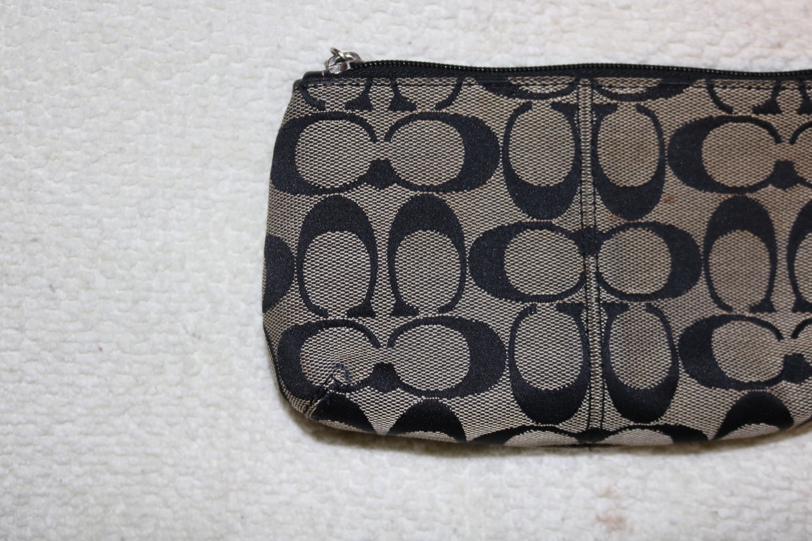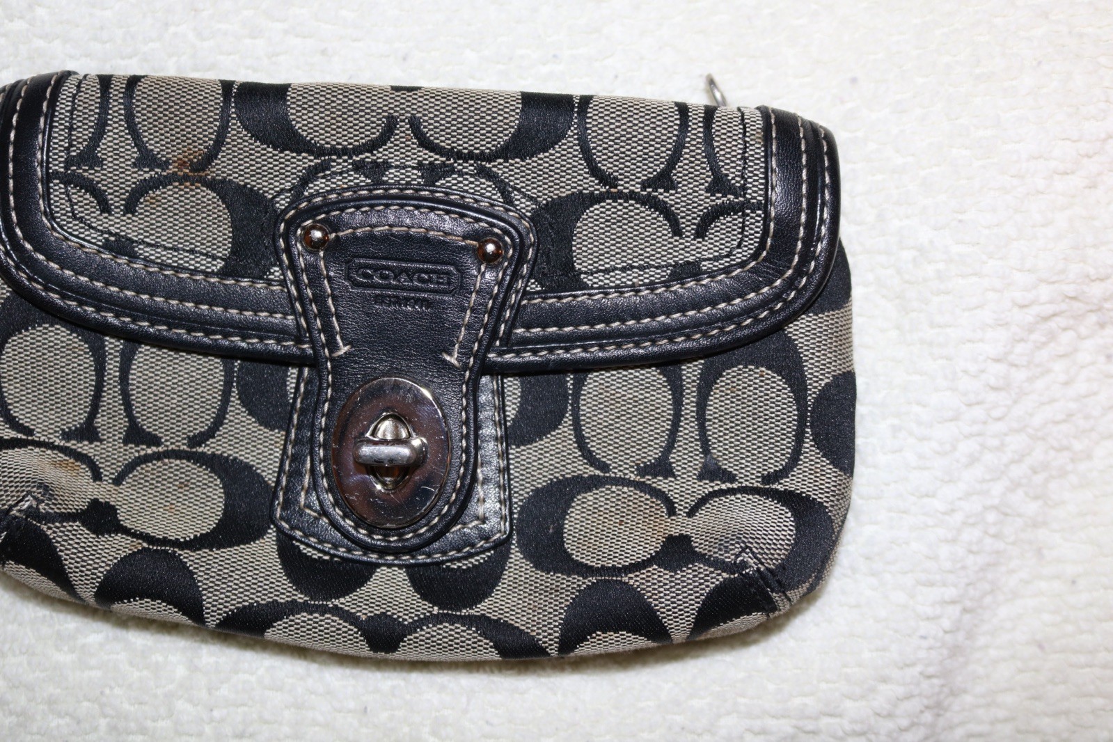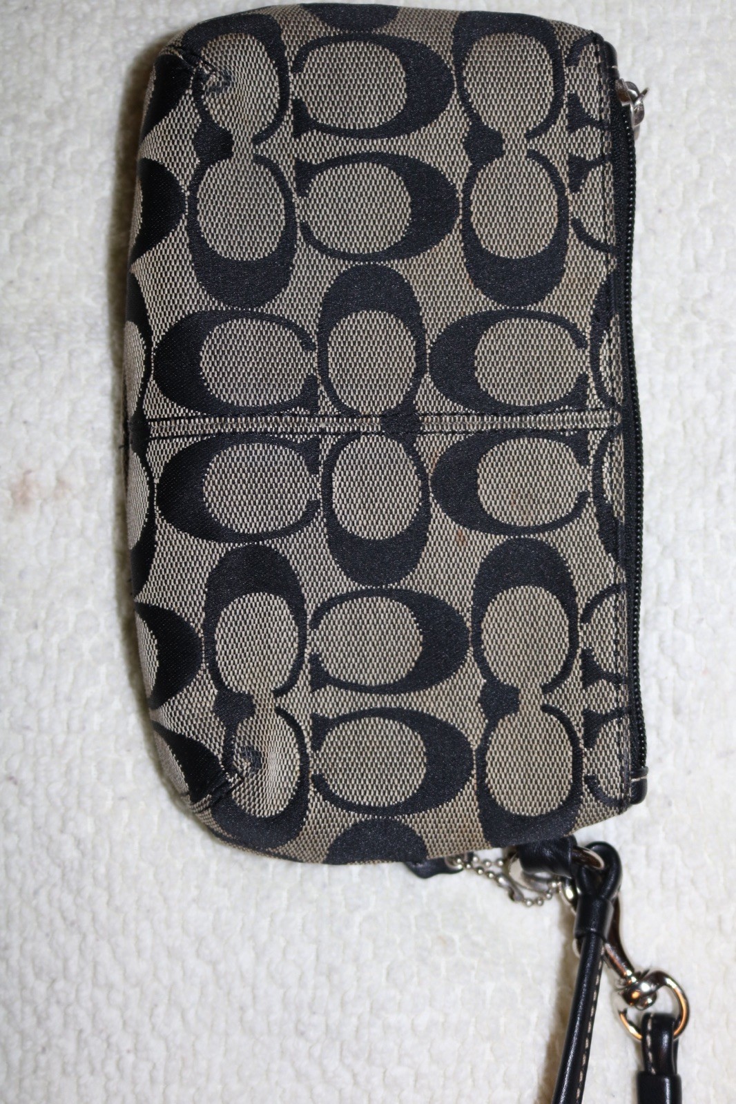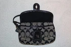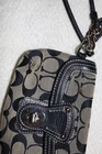 The Coach Signature Canvas Wristlet Clutch is a stylish and small accessory perfect for women on the go. With a turnlock closure and black handle/strap, this clutch features the iconic Coach logo pattern on brown canvas and leather exterior. The interior is lined with brown fabric and includes a wristlet accessory, making it a versatile and fashionable choice for any outfit. The silver hardware adds a touch of sophistication to this chic clutch from the Coach Signature Avary line.