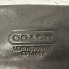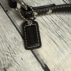 Coach small top handle bag in black. Genuine leather. Branding embossed on front. Silver tone hardware. Adjustable length top strap (11-13”) via belt like buckle, clip on one end & metal O rings at sides. Mini brand tag keychain. Zip close top. Inside lined with light lavender fabric & includes 1 slip wall pocket. 9” x 4.5” x 3.5”D Very light discoloration on bottom of lining (fixable)- otherwise perfect condition!