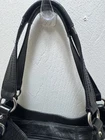 The Coach Soho Leather Hobo Bag in black with silver hardware is a stylish and versatile shoulder bag designed for women. Made from leather with a zip closure, this medium-sized bag features a black leather shoulder strap with a buckle accent and inner pockets for organization. The vintage design, along with the designer brand, exudes a sense of luxury and sophistication. The classic black exterior complemented by silver hardware adds a touch of elegance to any outfit, making it a must-have accessory for any fashion-forward woman.