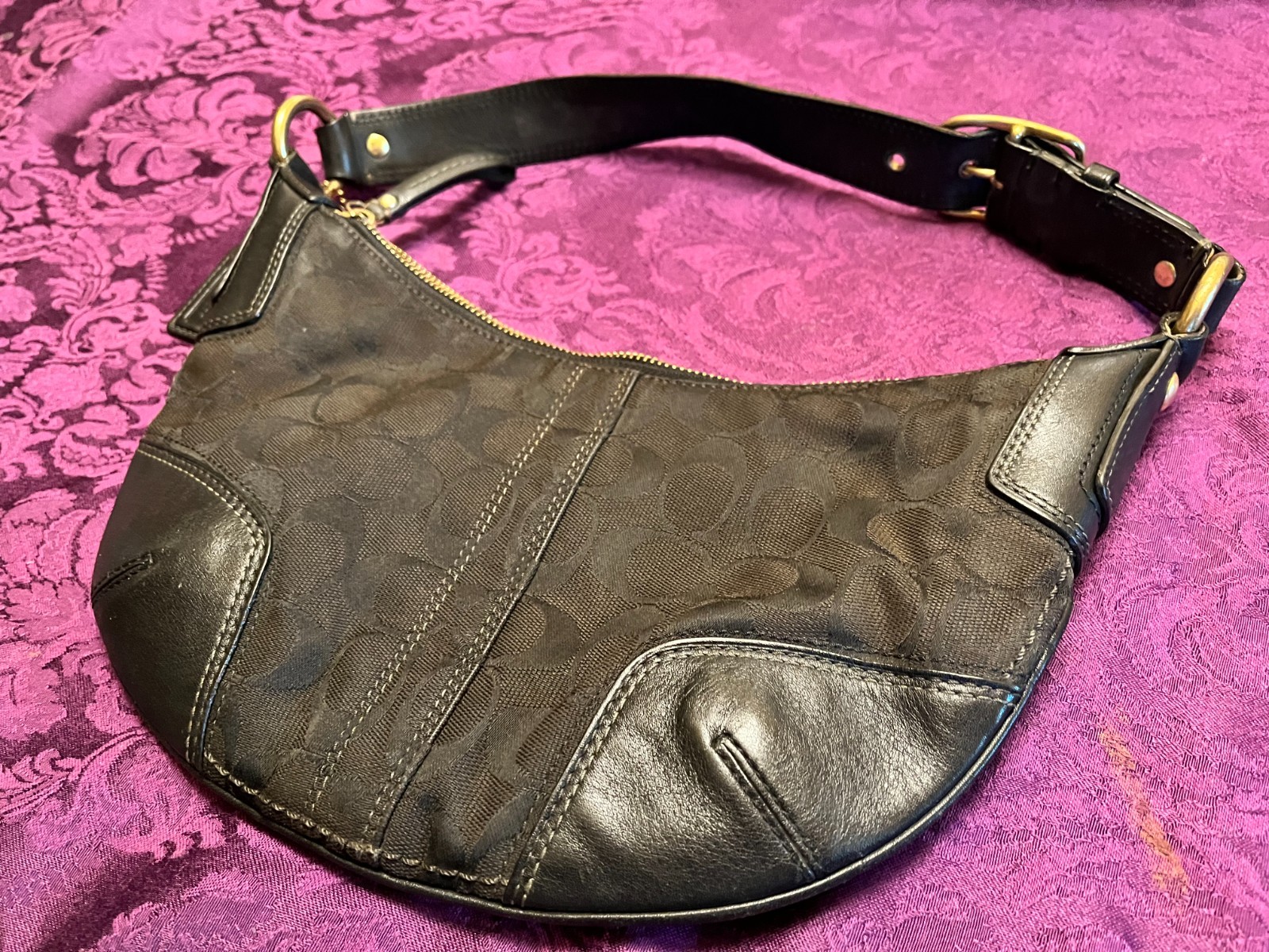 The Coach small black purse is a stylish and high-quality handbag designed for women. Made with leather, it features a zip closure, inner pockets, and a designer theme. The all-black exterior and lining add a sleek and sophisticated touch to any outfit. Perfect for adding a touch of luxury to your everyday look, this Coach purse is a must-have accessory for any fashion-forward woman.