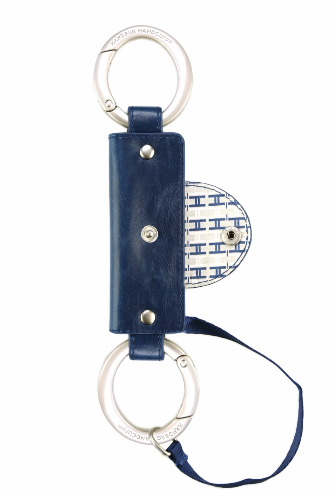 Handbag Handcuff® is a revolutionary new bag restraint that secures your bag with one click. Simply attach one cuff to your bag and the other cuff to your car’s headrest post, a shopping cart or a chair to keep your bag(s) in place and accessible while driving, shopping or dining. Use it with grocery and takeout bags, laptops and briefcases, gym bags, portfolios and even diaper bags. Take it anywhere! DETAILS Pearl nickel hardware with blue, grey and white lining D imensions: 10.0125"L x 2.25"W x 0.325"H Fade- and stain-resistant PU material Easy to clean Internally reinforced with webbing and lined with cotton Auxiliary strap for additional use options Lined interior pouch for storing emergency cash or contact information Hardware crafted from zinc alloy