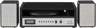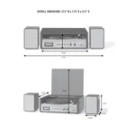 Three-Speed Belt-Drive Turntable: Plays 33 1/3, 45, and 78 RPM records on an aluminum platter; Includes a clear dust cover, a slip mat and a 45 adapter Quality Sound & Connection: An adjustable counterweight and a pre-mounted moving magnet cartridge deliver high-quality sound; Includes aux input and a headphone jack for private listening Bluetooth Record Player: Bluetooth connectivity lets you stream music from your mobile device through the matching full-range 40-watt (20W x 2) bookshelf speakers More to Love: This turntable system also includes a digital clock with an LED screen and an FM radio Design: Inspired by 100 years of innovations, our products blend vintage looks with modern technology; Radio products are proudly designed in the USA and come with USA-based customer support