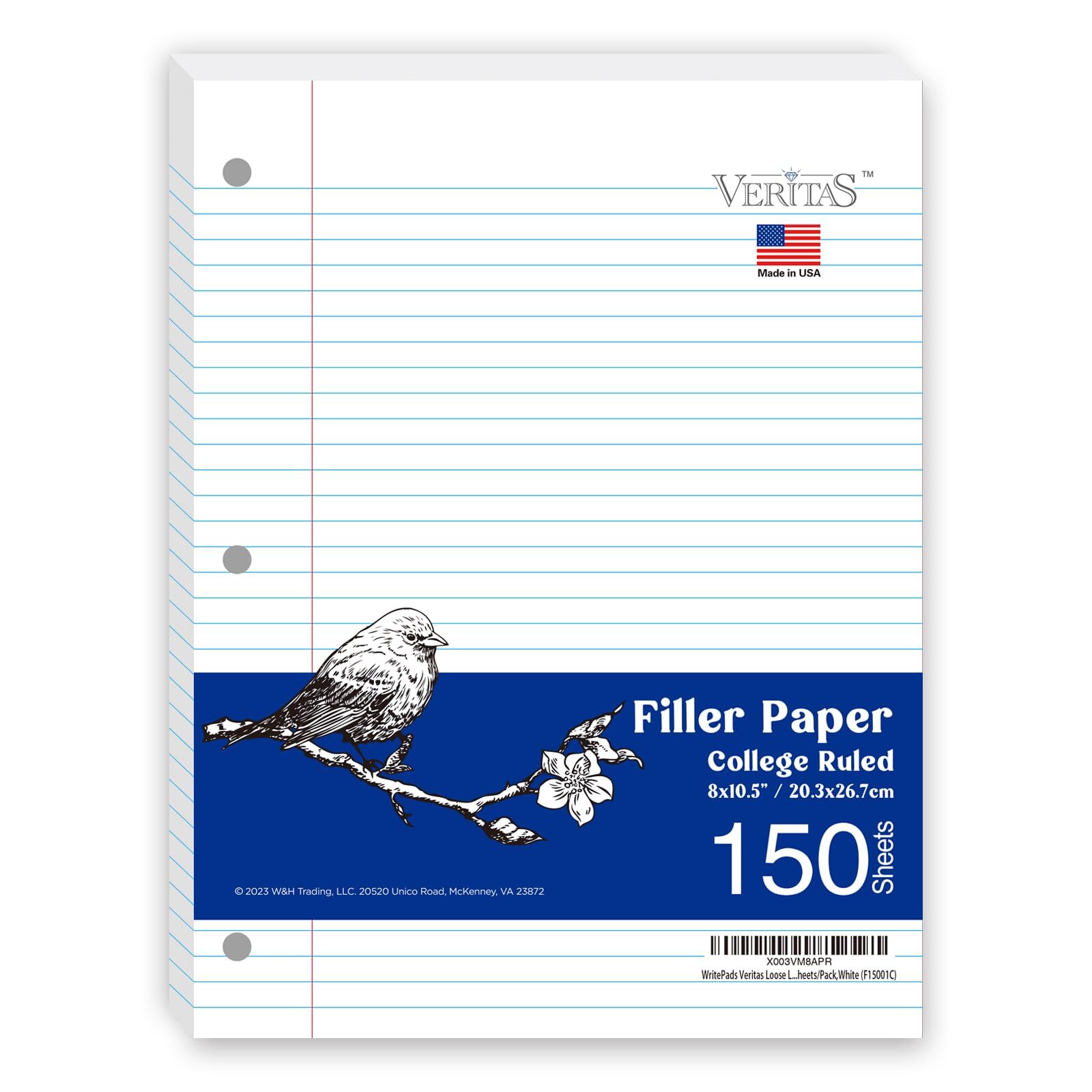 Notebook paper Loose Leaf Paper,Standard 8"x10-1/2" College Ruled Filler Paper, 3 Hole Punched Binder Paper For 3 Ring Binder, 150 Sheets/Pack, 4 Pack White (F60001C) Description Features: The WritePads Veritas Loose Leaf Paper is a standard 8"x10-1/2" size, providing ample space for writing and note-taking. It features a college ruled format, with evenly spaced lines to assist in neat handwriting. This filler paper is designed to fit perfectly in 3-ring binders, as it comes pre-punched with three holes. This feature allows for easy organization and integration into a binder system, keeping your notes organized and secure. Each pack of WritePads Veritas Loose Leaf Paper contains 600 sheets. You can rely on a long-lasting supply for various writing needs, whether it's for school, work, or personal use. Proud American Flag Design,Made in USA.The Veritas Loose Leaf Paper is made of high-quality materials, ensuring durability and resistance to tearing. The paper's smooth texture provides a comfortable writing experience, allowing your pen or pencil to glide effortlessly across the surface. This filler paper is suitable for a wide range of applications. Whether you're a student taking notes in class, an office worker organizing documents, the WritePads Veritas Loose Leaf Paper is a reliable choice for all your writing needs. Product Details: Color: College Ruled Filler Paper Sheet Size: 8 x 10.5 Inches Brand: WritePads Sheet Count: 600 Product Dimensions: 10.5"L x 8"W Manufacturer: WritePads Brand: WritePads Item Weight: 3.8 pounds Product Dimensions: 10.5 x 8 x 0.1 inches Item model number: KSU-F30001C Color: College Ruled Filler Paper Size: 4 Pack (600 Sheets) Sheet Size: 8 x 10.5 Inches Manufacturer Part Number: KSU-F30001C Date First Available: July 12, 2023 Handling We will ship all orders within 1 business days of payment. Delivery We do not ship outside of the Continental US. Feedback We take our reputation seriously, we buy and sell online, so we understand the value of trust. If you are unsatisfied with your order, please contact us and we will work with you to resolve it to your satisfaction.