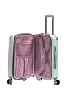 Description This carryon is made of ABS. The major benefits of this material - it is extremely lightweight, it is durable, and protects the contents of your luggage. Four multi directional spinner wheels rotate 360 degrees for easy maneuverability. This luggage allows you to pack more while avoiding the excess weight surcharges imposed by most airlines. Multi-directional spinner wheels for easy maneuverability Modern internal chrome telescoping handle with push button handle. Interior mesh and zip pocket and elastic pocket 5 year warranty 20"X13"x9" (22" height with wheels) weighs 6.5 lbs. 22"X13. 5"x10" (with wheels) Lightweight durable ABS material Multi-directional double spinner wheels Sturdy ergonomic chrome telescoping handle Interior mesh zip pocket and straps to secure clothing