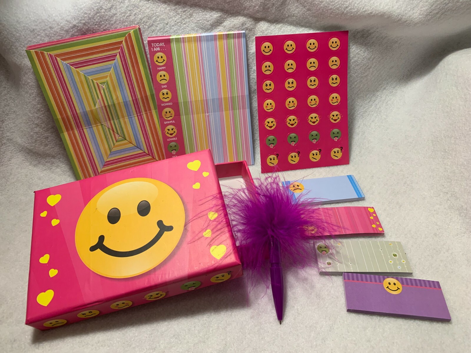 This Happy Face stationery set is super cute and fun! The box includes envelopes, sticky notes, stickers, and sheets—perfect for journaling or sending cheerful notes. The feather pen is adorable, though it doesn’t write, but everything else is unused and ready for creativity. Great for gift-giving or keeping yourself organized in style!