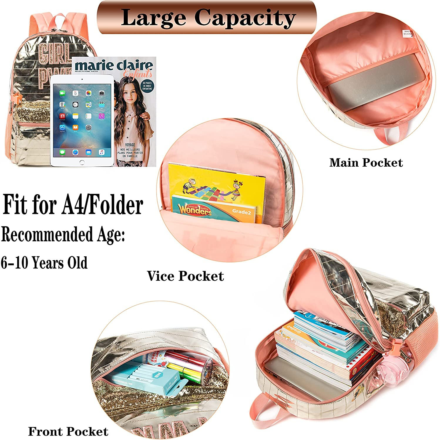 Store New Arrivals Add to Favorite View Feedback Contact Girls Backpack Size:backpack:16.5"X11.8"X5";Lunch bag:9"X8.2"X3.9", pencil case:9".Special Design:Lunch Box have buckle, can hung on the backpack,release your children's hands. [Kids Backpack Capacity]School backpack set including teens backpack,lunch box and pencil case,backpack contains 1 large main pocket with 1 laptop compartment,2 zipper front pockets;2 mesh pocket for bottle; [Backpack Quality]Lightweight Design,ergonomic bearing system-This bookbag has 2 mesh padded shoulder straps , back panel, perfectly fit the spine curve and keep proper gap with your kid's back,help to relieve shoulder pressure and timely radiate heat toe breathable and comfortable carrying experience.etc Recommend age:For girls between 6-12 years old.This lovely school bag is perfect choice for your kids Wide Application-The bookbag has smooth zippers for the kids to open and close easily.The lovely school backpack with lunch box is ideal for various occasions like school, travel, hiking and camping ,tourism.This cute bookbag is the best choice for teen girls.