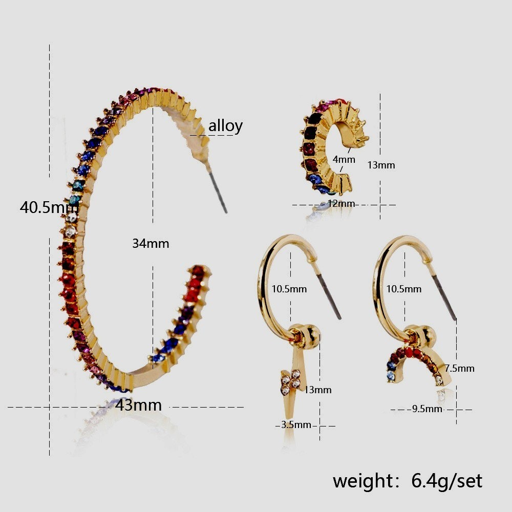 4 PC. FUN FASHION RAINBOW CRYSTAL EARRING SET WEAR ALL ON ONE EAR (As shown) OR SPLIT THEM UP ANY WAY YOU LIKE! SET INCLUDES: 1 - RAINBOW HOOP EARRING 1 - RAINBOW EAR CUFF 1 - RAINBOW DROP HOOP 1 - CRYSTAL LIGHTNING BOLT FOR MEASUREMENTS SEE PHOTO ALL VERY LIGHTWEIGHT AND COMFORTABLE TO WEAR MADE OF A GOLD METAL ALLOY & COLORFUL GLASS CRYSTALS COMES BEAUTIFULLY PACKAGED IN A GOLD/SILVER POUCH AS SHOWN SUPER FAST FREE SHIPPING!! 100% SATISFIED OR MONEY BACK NO QUESTIONS!! Purchase with confidence....Long-time, trusted seller!