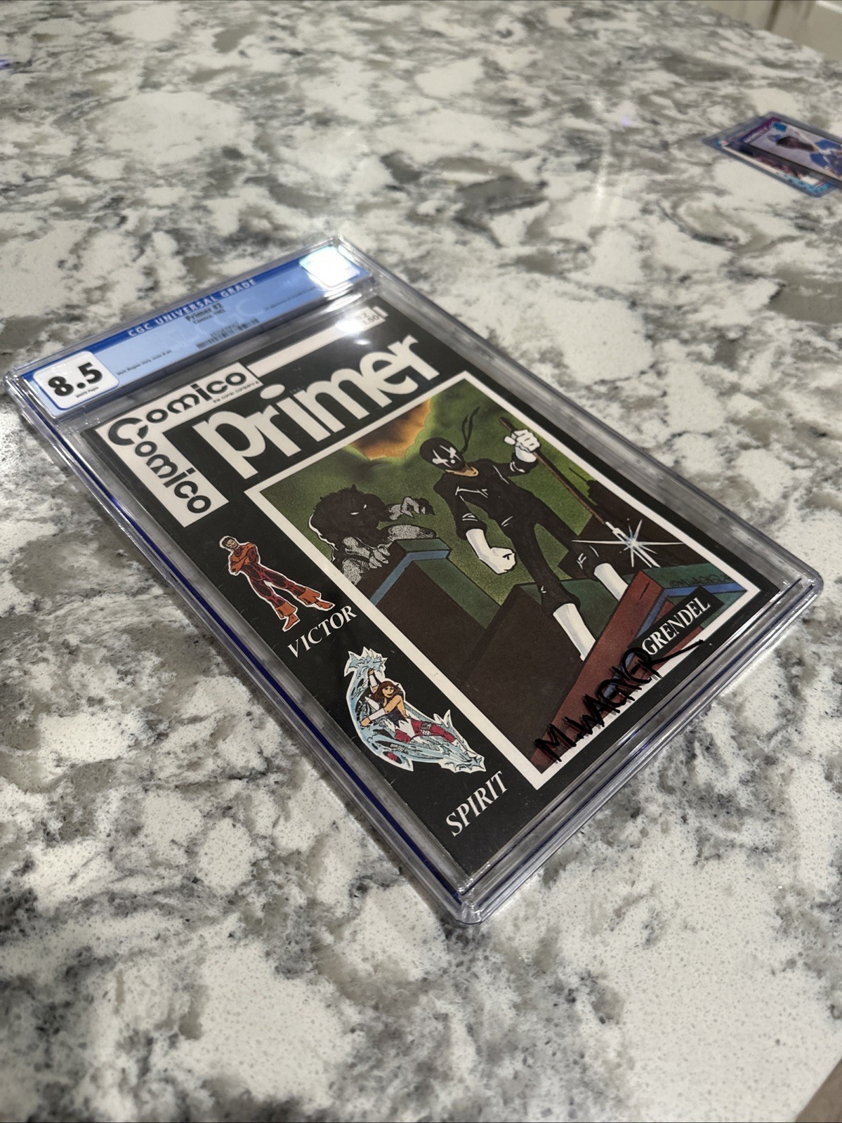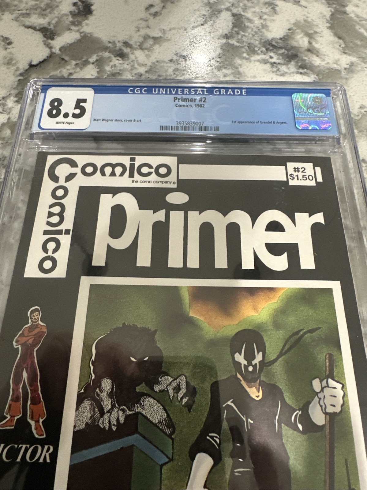 The product is a Comico Primer #2 trading card featuring the character Grendel, graded 8.5 by Certified Guaranty Company (CGC). The card is signed on the slab by Matt Wagner, adding a unique and collectible element to the item. This rare and highly sought-after piece is a must-have for fans of the Comico franchise and collectors of non-sport trading cards, especially those interested in the iconic Grendel series.