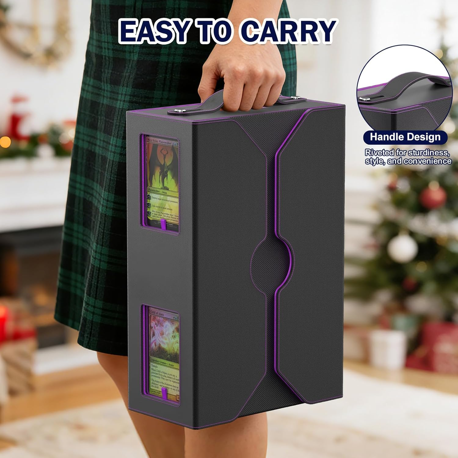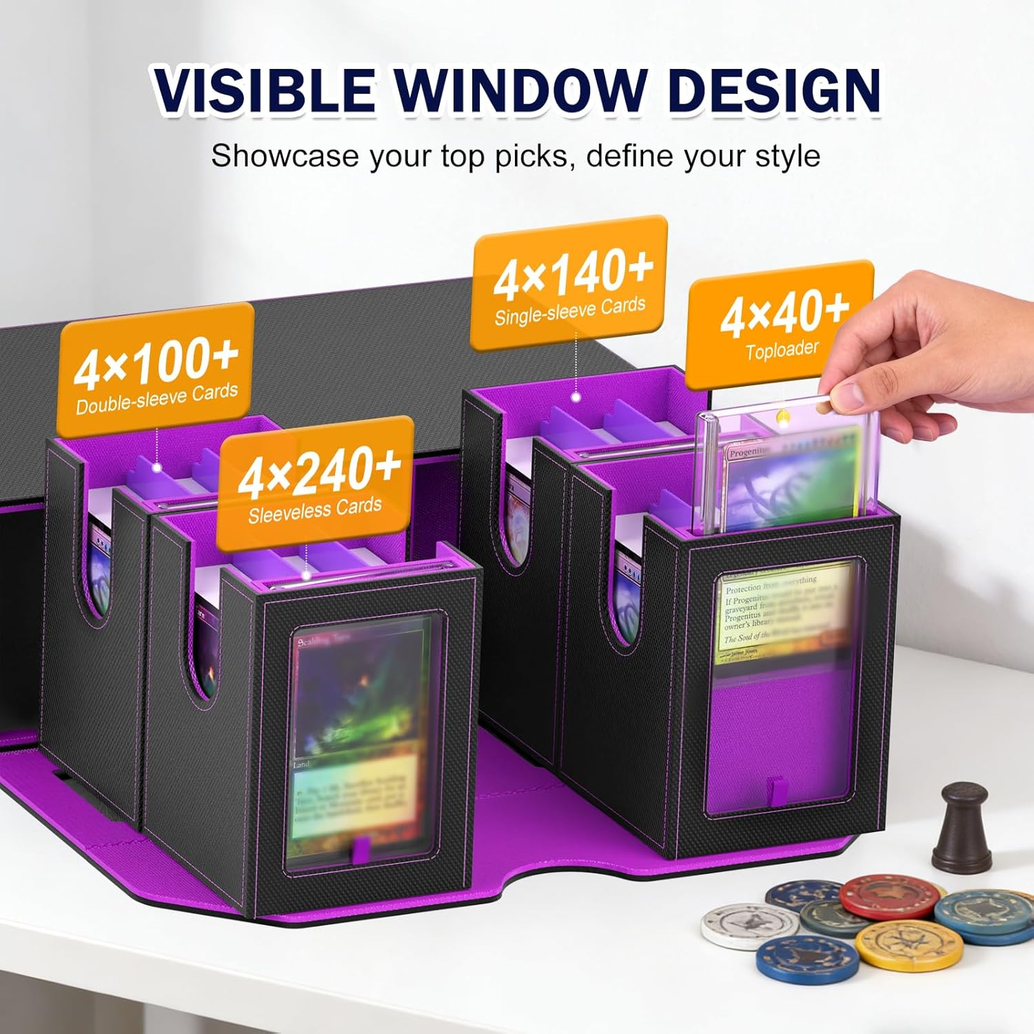 5-in-1 Modular Design: Features 4 removable card boxes and 1 large central storage box that doubles as a dice tray. Store all tokens and accessories, eliminate clutter from scattered boxes. Organize all your gaming gear in one portable case, a thoughtful gift for dedicated players Stylish and Portable with Display Windows: A sturdy, rivet-fixed top handle makes it easy to grab and go for game nights, tournaments, or travel. Each mtg deck box features a clear display window, comes with 4× 35PT magnetic acrylic card holders. Safely showcase your commander or rare cards for instant recognition and elegant display Magnetic Secure Closure: Each deck box attaches firmly with built-in strong magnets for smooth insertion and secure hold. Cards stay protected even when shaken or inverted, delivering maximum security for your valuable collection during transport All-Round Premium Protection: Constructed with thickened PU leather and reinforced stitching, waterproof, robust, and hard-wearing. The plush microfiber interior lining gently protects your cards from dust, scratches, and wear, keeping them in mint condition over time Ideal Gift for Card Enthusiasts: Designed for serious collectors, each card case holds 100+ double-sleeved cards, 140+ single-sleeved, or 240+ unsleeved cards to support growing collections. Includes 10 dividers for organization. With its massive capacity and luxurious look, it's the ideal gift for MTG, TCG, and sports card collectors Product description