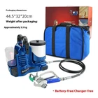 Latex paint electric spray gun backpack lithium models home furnishing high pressure airless sprayer small DIY spray gun Product Parameter Name:Plunger type lithium sprayer Maximum pressure:15Mpa Pressure regulation: 6 speeds of pressure regulation Maximum power:500W Hopper volume:1.2L Weight of the whole machine: about 5.3kg Spraying materials: latex paint, paint, water-based paint, marking paint, etc.