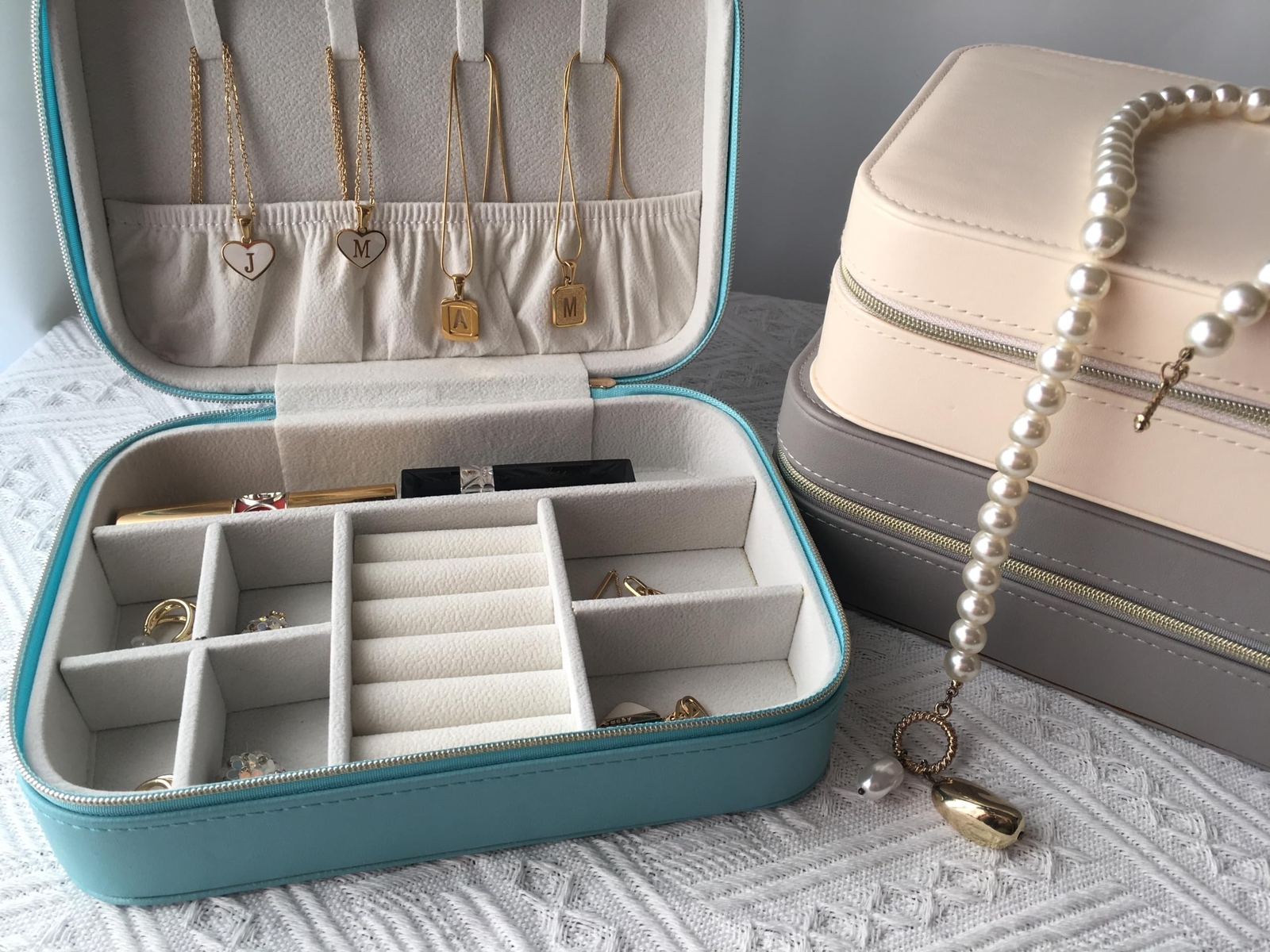Jewelry Box for Travel,PU Leather Jewelry Case,Jewelry Organizer,Small Jewellery Boxes for Girls,Earrings Rings Necklace,Wedding Birthday Gift for Women Blue Product Details Color: A-blue Brand: Ominigag MPN: Does not apply UPC: Does not apply EAN: Does not apply Color: A-blue Brand: Ominigag Material: Faux Leather Style: French Special Feature: Portable Recommended Uses For Product: Necklace Product Dimensions: 7.87"D x 2.56"W x 5.51"H Target Audience: Women, Girls Shape: Rectangular Occasion: Mother's Day, Wedding, Graduation, Thanksgiving, Memorial Day Item Dimensions D x W x H: 7.87"D x 2.56"W x 5.51"H Manufacturer: Ominigag Brand Name: Ominigag Recommended Uses For Product: Necklace Target Audience: Women, Girls Number of Compartments: 4 Number of Drawers: 2 Jewelry Storage Type: Jewelry Box Closure Type: Buckle Special Features: Portable Shape: Rectangular Occasion: Mother's Day, Wedding, Graduation, Thanksgiving, Memorial Day Style: French Color: A-blue Inner Material: Engineered Wood, Faux Leather Material: Faux Leather Ideal Gift Choice Stylish appearance, perfect gift for mothers, wives, girlfriends, daughters and other women and teenage girls at weddings, Christmas, birthdays, anniversaries, Mother's Day, Valentine's Day. It is also a perfect additional gift for people who travel a lot. High QualityJewelry organizer covered with PU leather on the outside, premium velvet lining not only prevents jewelry from scratches and bumps, but also makes it easy to display jewelry, buckle closure, very easy to loosen and reclasp. Medium size, can be carried around and also protects the jewelry well, perfect for travel and daily use. Reasonable Design Multi-functional travel jewelry organizer can easily fit into your luggage, not only can you place all items separately and won't be squeezed in your luggage, jewelry can be arranged in an orderly manner and won't get tangled together. The small size is perfect for daily use and traveling. Compact and PortableThe jewelry organizer measures 7.87" * 5.51" * 2.56", but the storage capacity is very strong, big enough to store jewelry, small enough to save space, very easy to take out of drawers or throw into luggage. Plus, it weighs only 10.23 ounces, making it perfect for organizing jewelry while traveling. Multi-purposeThis jewelry organizer includes 5 ring rolls, which can store 10 rings, 4 necklace hooks, 2 removable dividers, which can store watches, lipsticks and other large items.