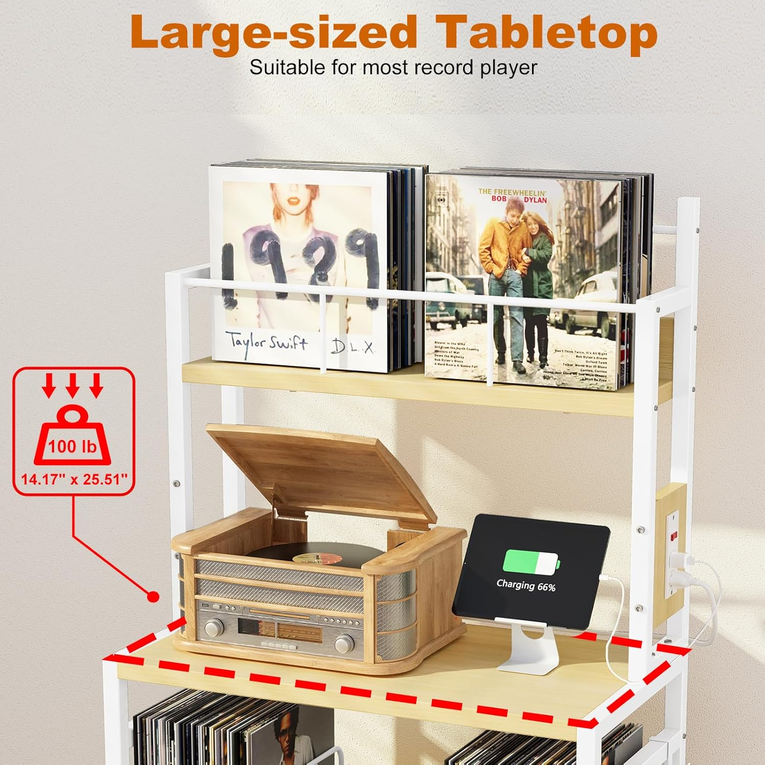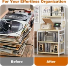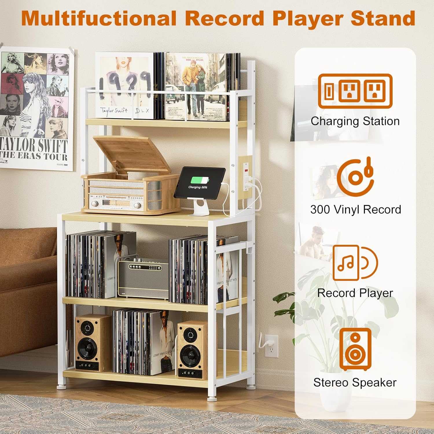 Store New Arrivals Add to Favorite View Feedback Contact Record Player Stand with Vinyl Storage, Turntable Stand Holds up to 300 Albums, Large Record Player Table with Charge Station, Vinyl Record Stand for Living Room Bedroom, Beige Description Item model number RPS-BG Shelf Type Cubby Shelf Shape Rectangular Room Type Living Room Material Wood, Iron Mounting Type Freestanding Number of Items 1 Assembly Required Yes Color Beige Finish Type Painted Product Dimensions 14.17"D x 27.17"W x 58.39"H Age Range (Description) Adult Country of Origin China Item Weight 25.6 pounds Model Name RPS-BG Number of Shelves 4 Special Feature Tall Included Components Countertop Large Size & Large Capacity: Specifically enlarged, the tabletop(Dimensions:14.17"D x 27.16"W)of our record player stand can accommodate nearly any size of record players. You can enjoy your music without worrying about your turntable sliding off. Featuring three spacious shelves, our record player table can hold up to 300 vinyl records, while the two lower tiers can store audio equipment or other media essentials, providing a home for your treasures 4-Tier Vertical Design: Our vinyl record stand features a vertical structure with four tiers, the top tier serves as the vinyl record storage area, allowing you to organize and store your frequently listened to vinyl records as you prefer. The record player shelf is positioned 31 inches high off the ground, eliminating the need to bend down when playing your music and ensuring your comfortable listening experience Multi-function: With two built-in charging sockets and a 6.56-feet power cord, the turntable stand facilitates the process of powering up your record player. Ample space at the bottom for your audio equipment, magazines, books, etc. Four dividers enable you to organize your records efficiently. We have integrated some detailed designs into our vinyl record player stand to ensure they meet your specific needs Steady and Stable: Constructed with a sturdy metal frame and high-quality wooden board, this record stand can hold up to 90 lbs per shelf. The iron pipes on the sides add stability and prevent deformation. Adjustable feet remove your concern that the record player cabinet may not be stable on uneven surfaces Easy Assembly: We have labeled all the components of the record player stand with vinyl storage and prepared very detailed installation instruction for you to ensure that you can assemble the vinyl record table in less than 10 minutes. EasyCom pays attention to details and is dedicated to enhancing your shopping experience Product Description Record Player Stand with Vinyl Storage Record Player Table with Large-sized Tabletop ABOUT US We offer the best prices around on high quality products. Our E-store includes media such as books, movies, music and games while offering electronics, toys, sporting apparel, clothing, tools, general home, garden items and more. SHIPPING We are always working hard to ensure your package arrives as soon as possible. Please understand that some factors like weather, high postal traffic, and the performance of shipping companies are outside of our control. We offer free shipping to the lower 48 states and ship within 2 business days of payment, usually sooner. We do not accept P.O. Boxes. Please provide a physical address. For shipping outside of the continental USA, we only use eBay's Global Shipping Program.The item is shipped to KY and then sent to the rest of the world. International customers are responsible for all duties and taxes. Continue to check out in order to calculate costs for shipping the item to your country. Messages regarding eBay's Global Shipping Program MUST be directed at eBay EXCLUSIVELY. RETURNS We offer a 30-Day Return Policy on items which you are not completely satisfied with. You have the option for a full-refund or an exchange of the item. No returns are available on items shipped outside of the USA. PAYMENT We accept PayPal. CONTACT US This page content is yet to come Please ad us to your favorite seller and visit again later Thank You CUSTOMER SATISFACTION We try our very best to make sure every customer is completely satisfied. If there's a problem, message us! We're happy to help.